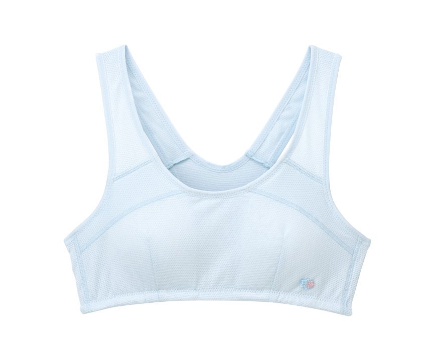 バスト上部にテープ状のサポート生地を付けることでからだにフィットし、ズレにくいバックスタイルのストラップでスポーツ時にも対応。バストトップ部分の裏打ちに厚みのあるやわらかい不織布を使用しており、成長するジュニアのバストをふんわりサポート。