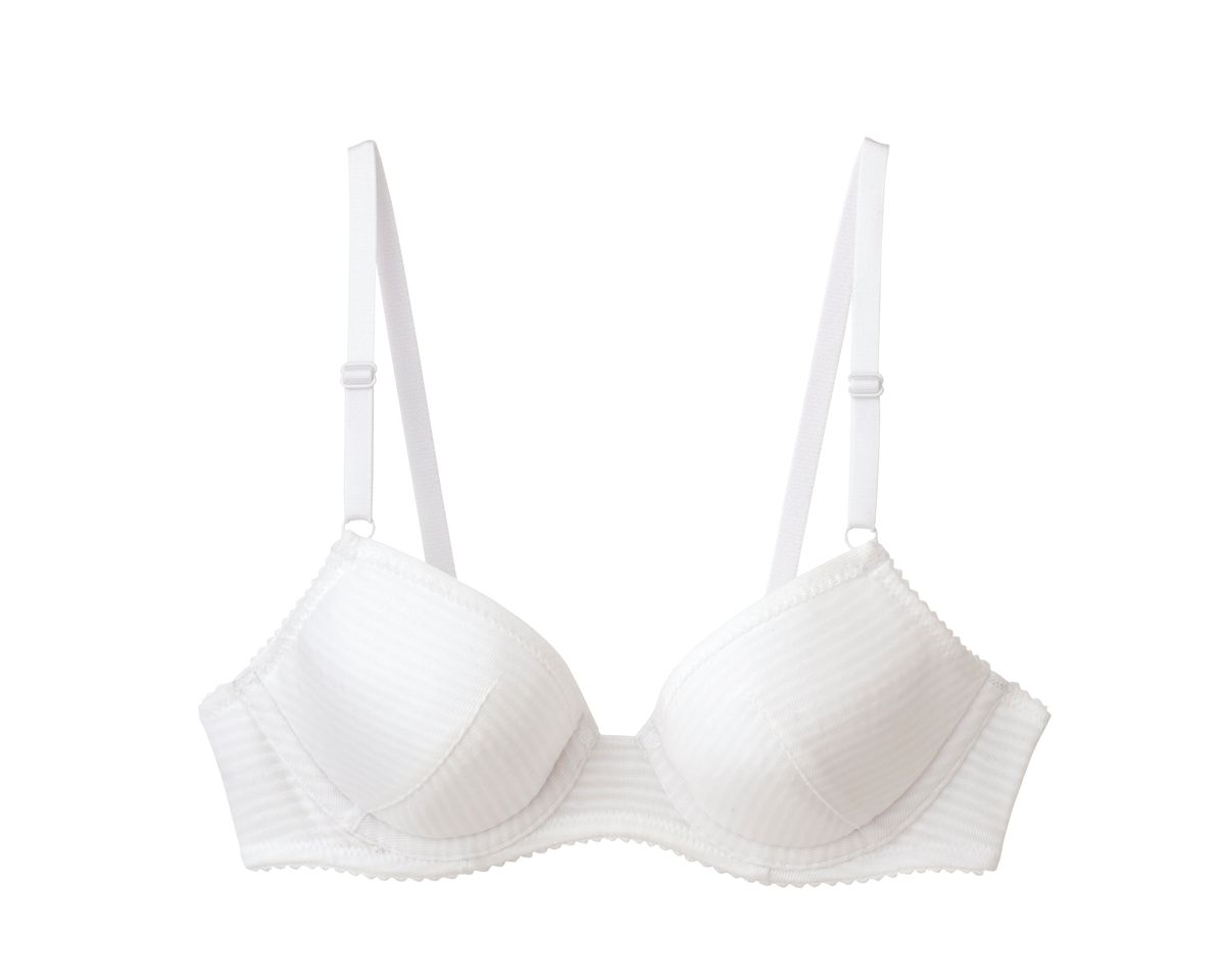 バストへの圧迫が少ないやわらかな樹脂を使ったU字樹脂ワイヤーにより、成長に合わせたゆるやかな深めのカーブで、まるくふくらむバストの輪郭に沿ってきちんと支えてくれる。シンプルなボーダー柄で、スクールにも対応したデザイン。