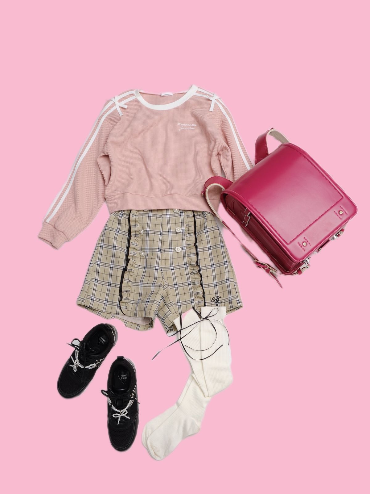 やさしい印象のカジュガーリーなら、通学コーデでもかわいく見せられる! 動きやすさ重視だけどリボンやフリルをしのばせてます♡