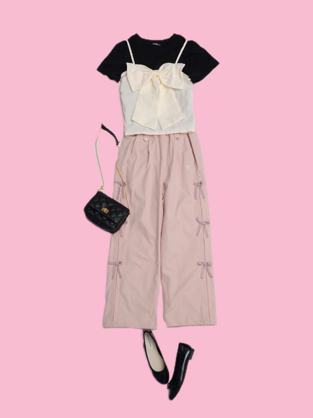せっかくの休日だし、ビスチェやロングパンツを取り入れてちょっぴり背のび。ピンク色をベースに、オトナ見えするモノトーンをデートで着たい♡という意見多し!リボンビスチェ¥2490/URBAN CHERRY Tシャツ¥3630/バイ ラビット パンツ¥17600/メゾ ピ アノ ジュニア ショルダーバッグ(参考商品)/グローバルワーク(アダス トリア) バレエシューズ¥6600/オリエンタルトラフィック(ダブルエー)