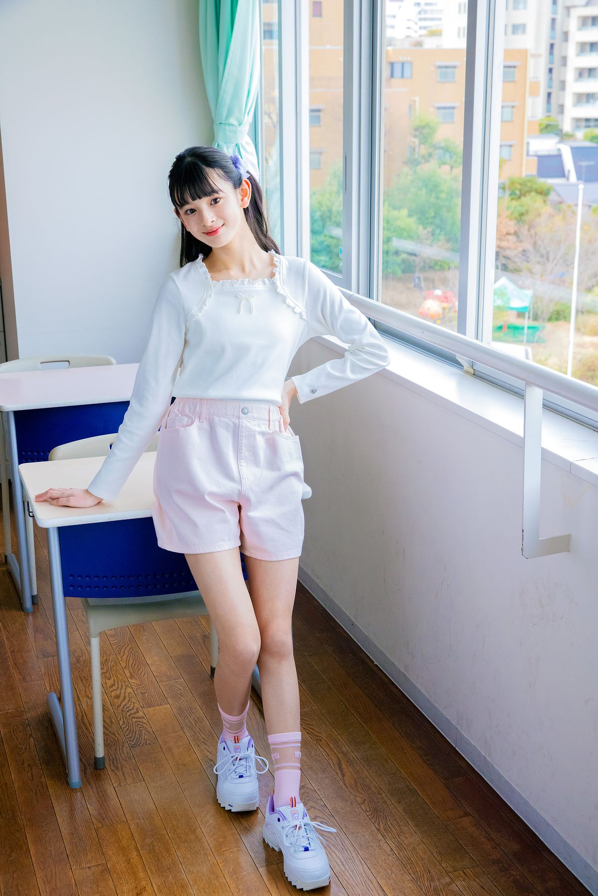 リボンのワンポイントにフリルなどかわいさ要素満点のトップスにはピンクデニムでカジュガーリーコーデに♡ヒナちゃん☆トップス¥3500/ブルーデイジー(ホープス) デニムショーパン¥1500/ユニクロ シュシュ¥330/パリスキッズ原宿本店 ソックス¥1089/バイラビット スニーカー¥9790/フィラ