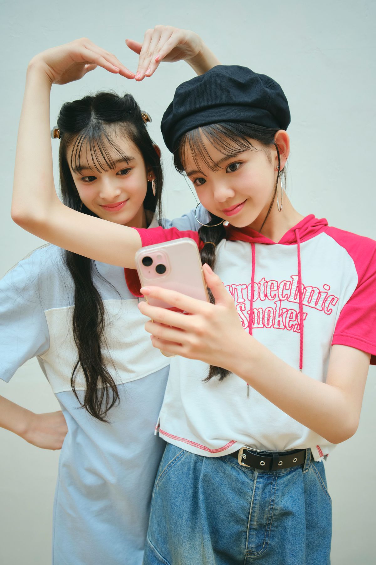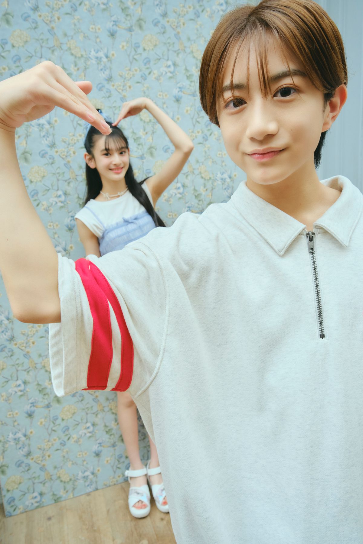 末永 ひなた☆ワンピース¥5060/シスター ジェニィ ヘアピン(2本セット)¥770/ ミナキュート(メテオAPAC) イヤリング¥ 550/パリスキッズ原宿本店 ハイソック ス¥1320/靴下屋(タビオ) スニーカー ¥14630/ナイキ スポーツウェア 山腰 理紗(リサ)☆Tシャツ¥3630/ アルジー パンツ(ベルトつき)¥16 390/ポンポネット ジュニア ベレー 帽¥780/ルピス イヤリング¥550 /パリスキッズ原宿本店 スニーカー ¥3480/VIVIAN COLLECTION