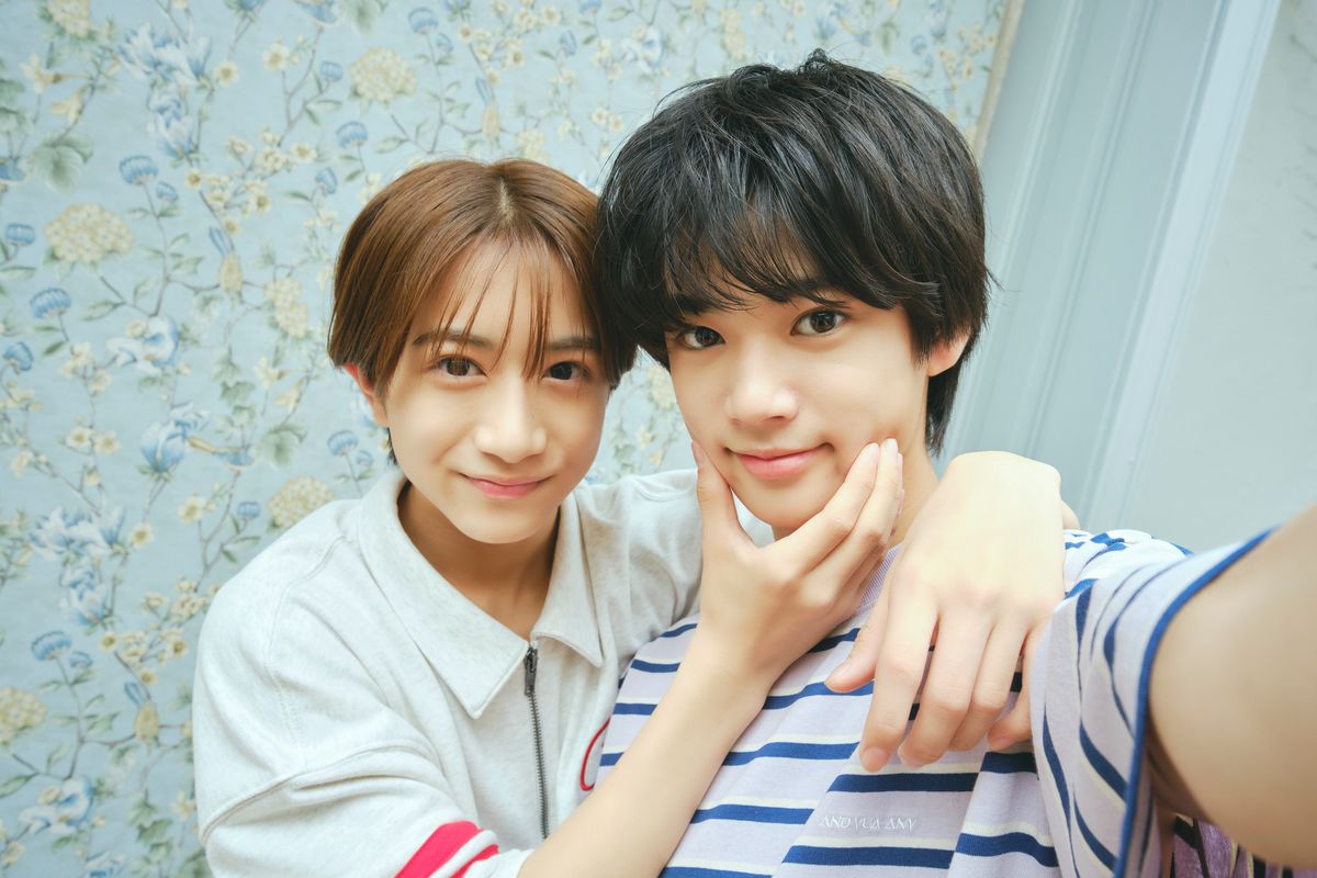 右のコは左手を友達の肩に回して、右手でほっぺたをぷにっと♡ できるだけぎゅーっと近づいて、左のコが自撮りしてね!