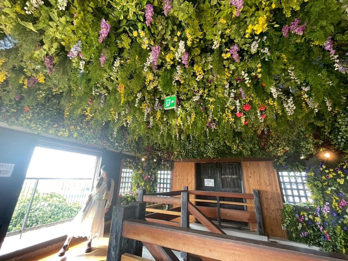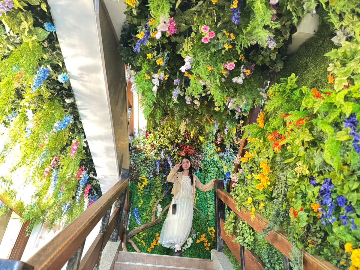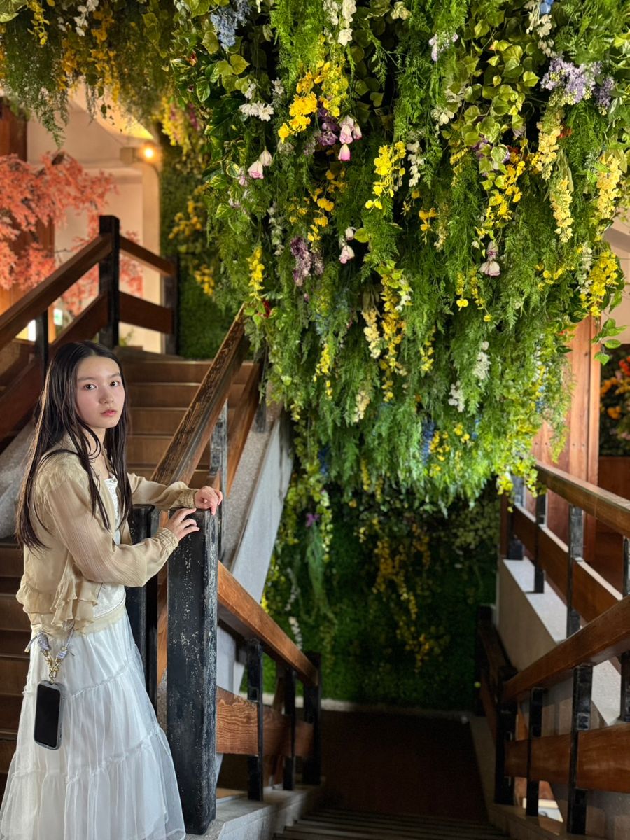 上に続く階段にもたくさんの緑やお花があって異世界っぽい✨