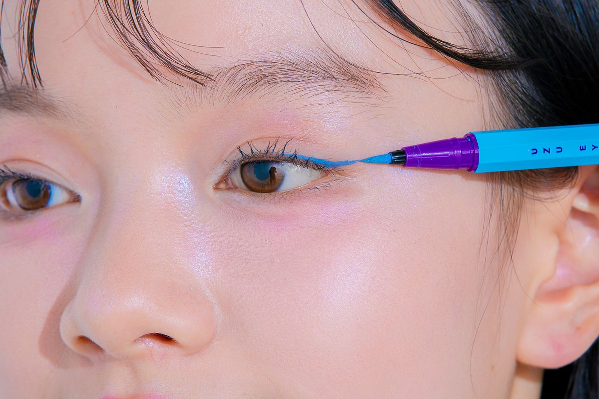 ②目をひくブルーのアイラインを目尻から引いて、しっかりはね上げよう! さわやかライトブルーが夏にぴったり♪