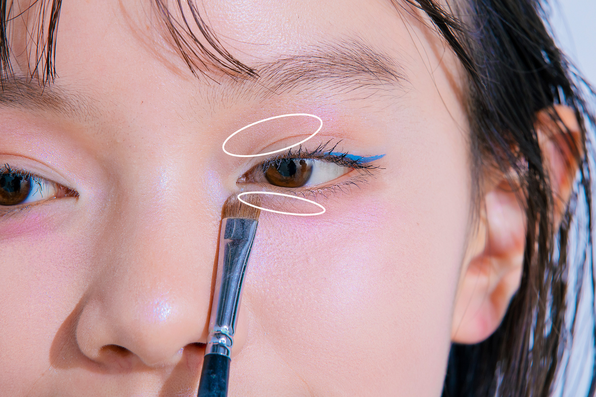 ①アイシャドウは目頭から黒目のあたりまで、涙袋も同じく目頭から黒目の下までぬるよ。アクセントのブルーは全体にぬりすぎないのがコツ!