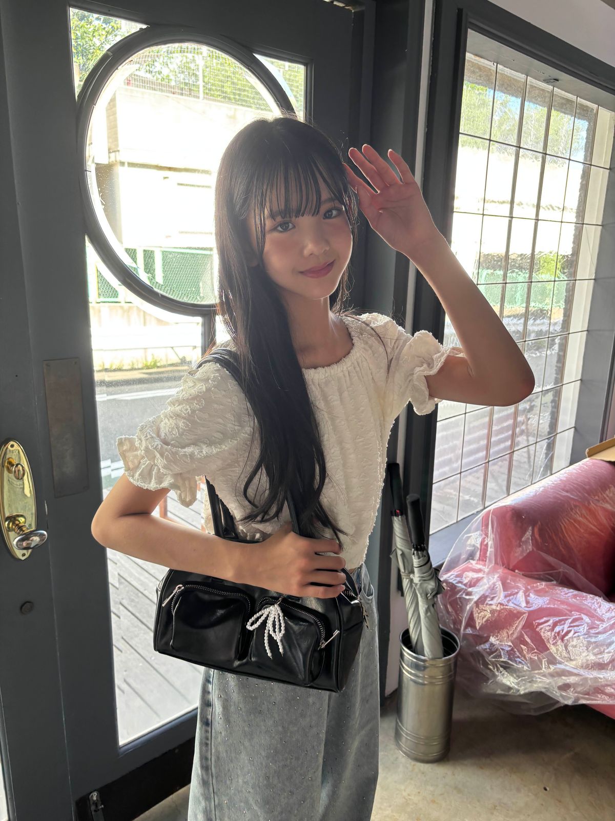 うしろに大きなリボンがついているブルーデイジーのトップスは甘くてかわいくて盛れる! ボトムスにはラインストーンがたくさんついていて韓国っぽ。