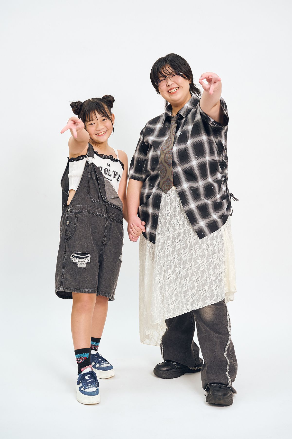 クール、ストリート系が大とくいのお二人は、ふだんからTシャツをシェアしているそう! 今回はデニムの色を合わせて、それぞれのキャラを引き立てながらリンクも忘れていません☆