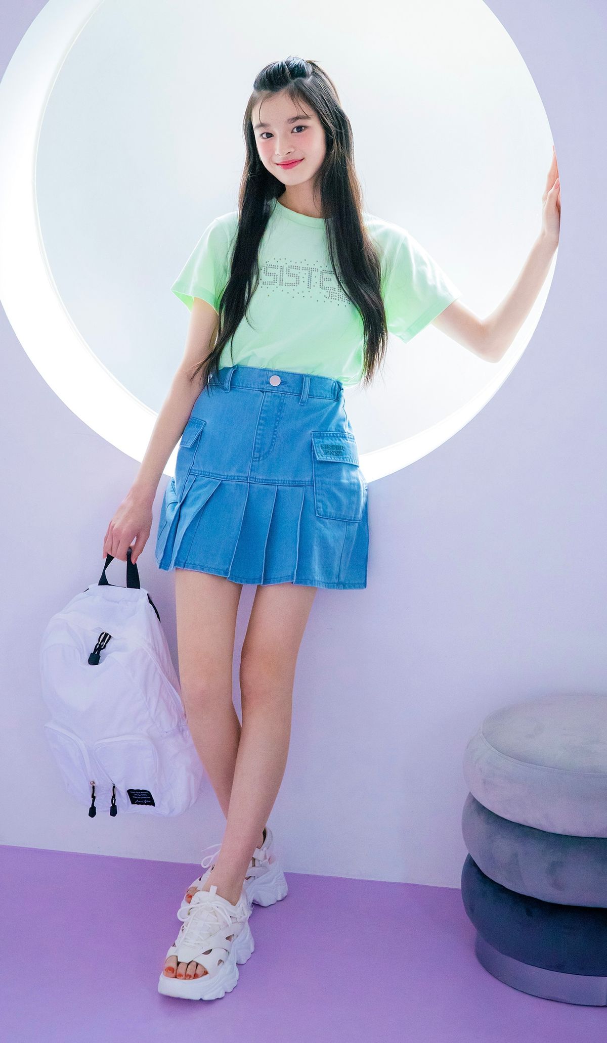 ラインストーンのロゴがしゃれてるミントグリーンTには、相思相愛のデニムをチョイス。360°スキのないクールカジュアルコーデで夏を制す♡ヒナちゃん☆Tシャツ¥3960、スカート¥4950/ともにシスタージェニィ リュック¥5060、サンダル¥5060/ともにジェニィ