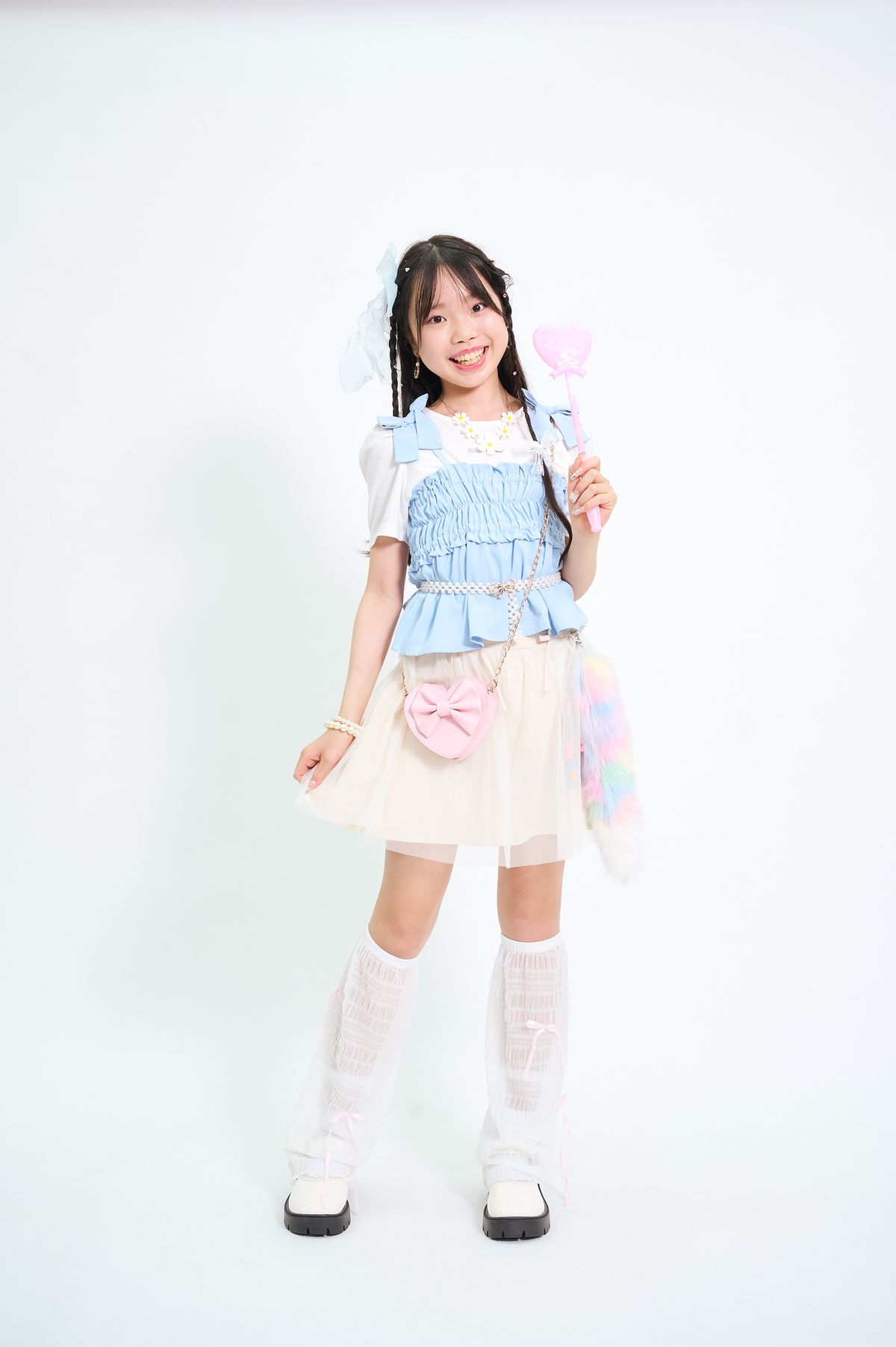 すずしげなホワイトとブルーをメインに、小物でパステルカラーを追加! レッグカバーでギャルみを出したよ♡