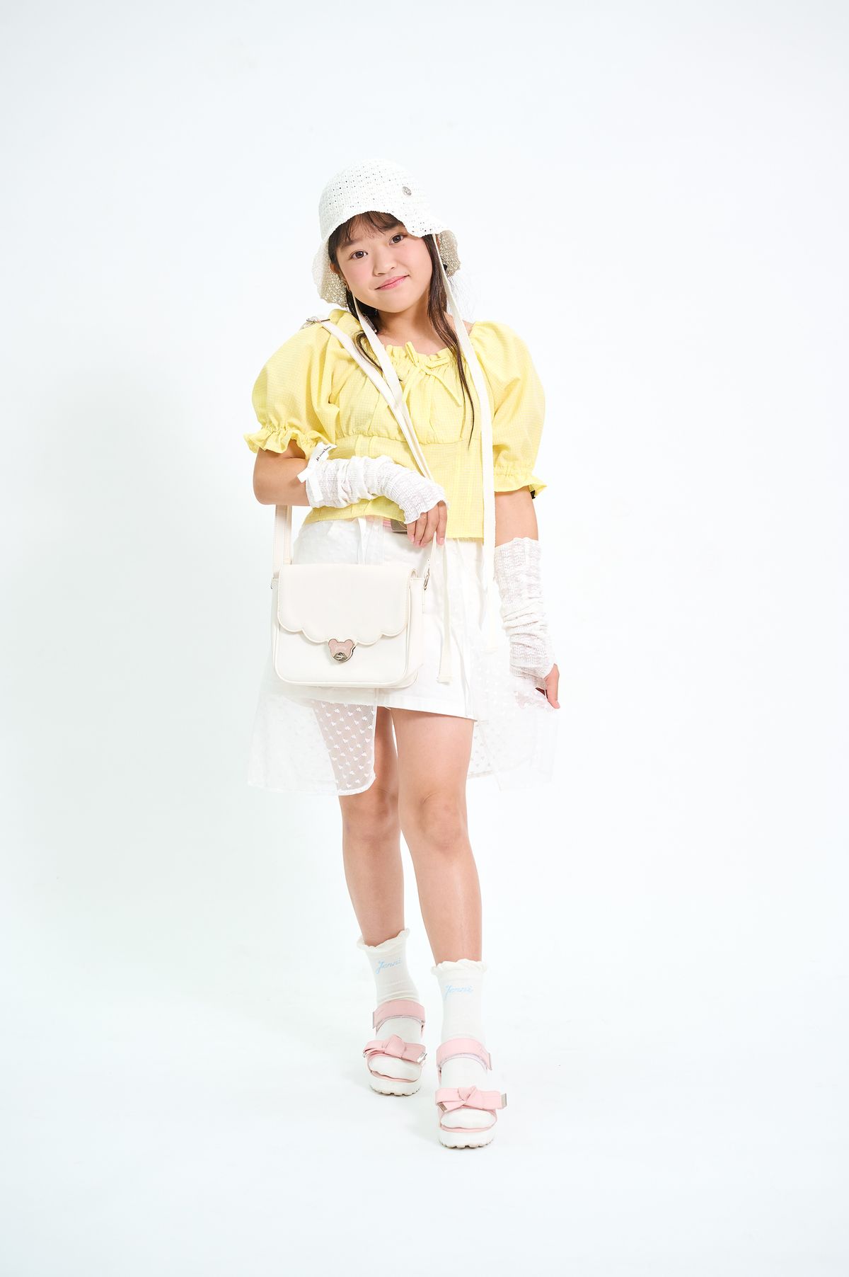 イエローのパフスリブラウスや白レースなど人気アイテムをぎゅっとつめこみ! ほどよいぬけ感も出したよ♪