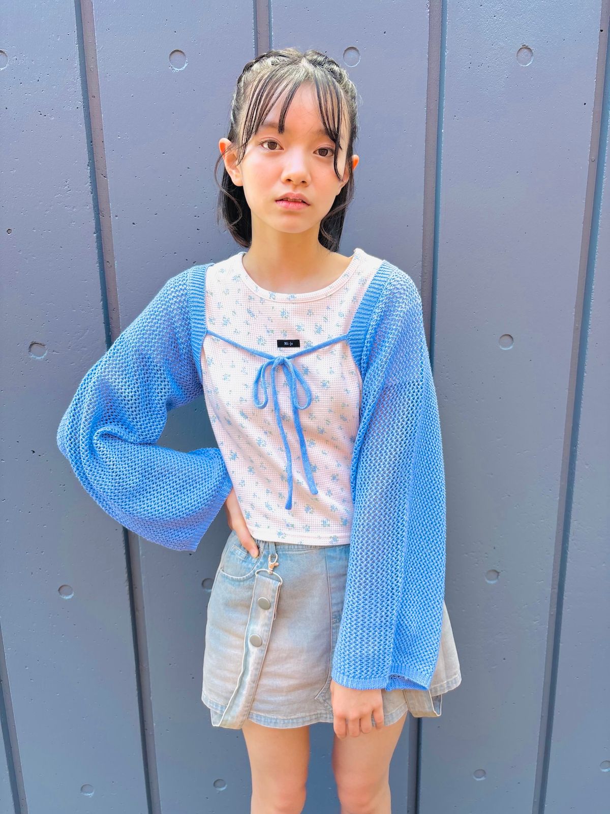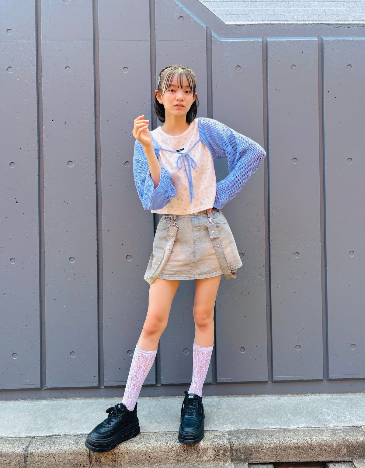 ミジェの小花柄ミニTシャツにメッシュカーディガンとビスキーのサス付きデニムスカートで韓国っぽカジュアル🩵🩷