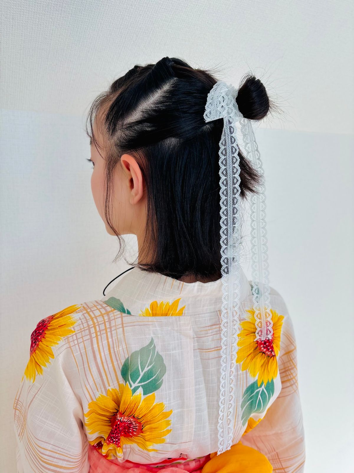 髪型はハーフアップのお団子にレースのリボンをつけたよ🤍これから浴衣を着る子は参考にしてみてね😘
