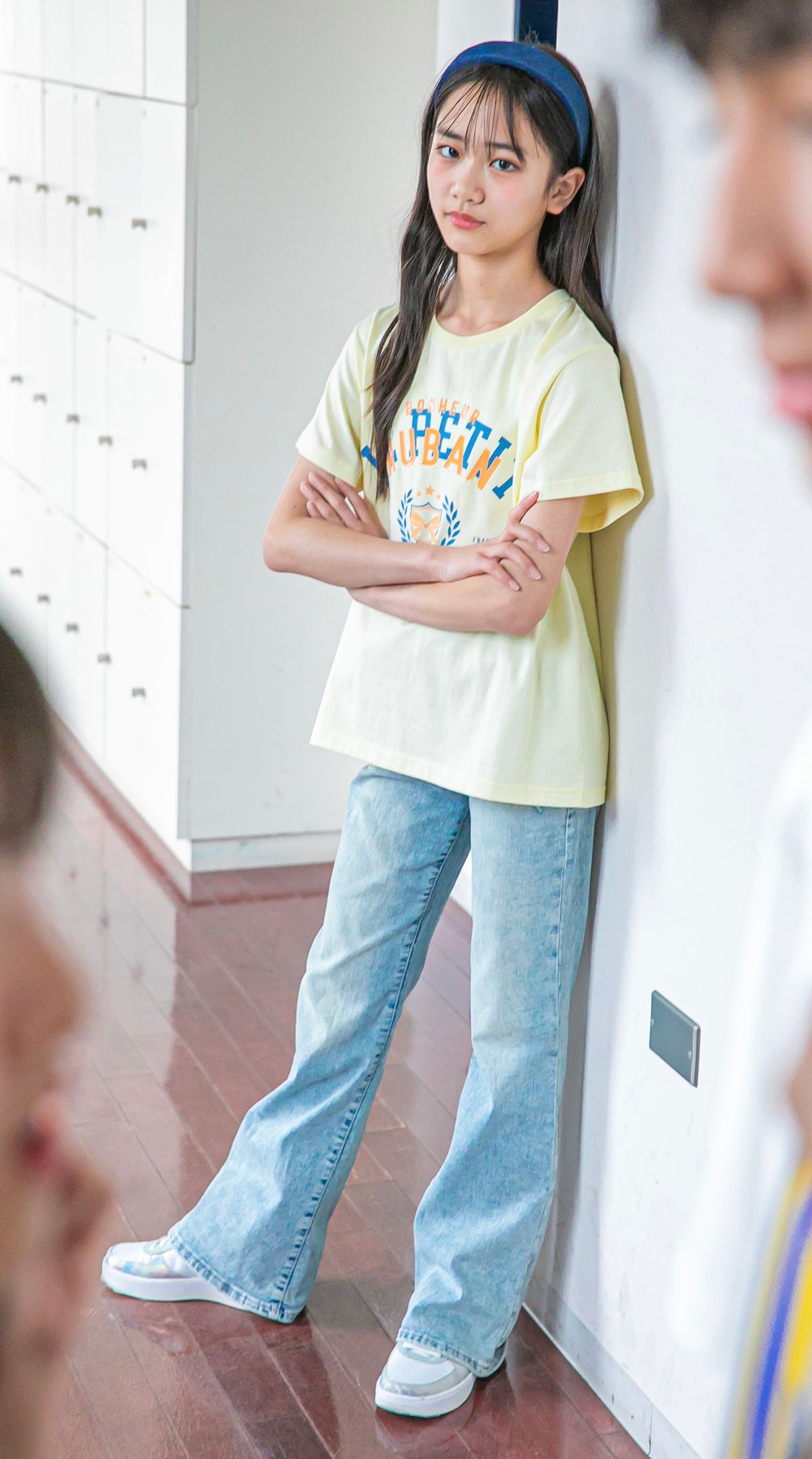 Tシャツ × デニムの定番ワンツーコーデは、どちらもあわい色でまとめると夏っぽく明るい印象に♡