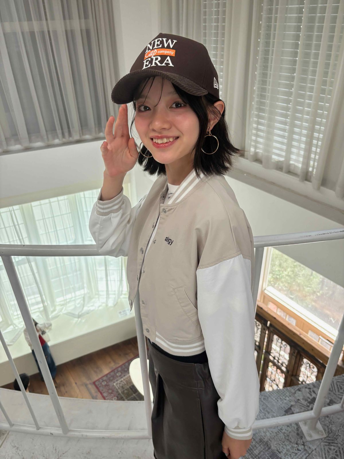 お姉さんプチ㋲のアオカはキャップが似合ってる! 白を基調とした撮影場所にぴったり。
