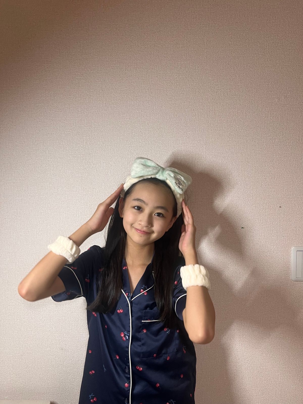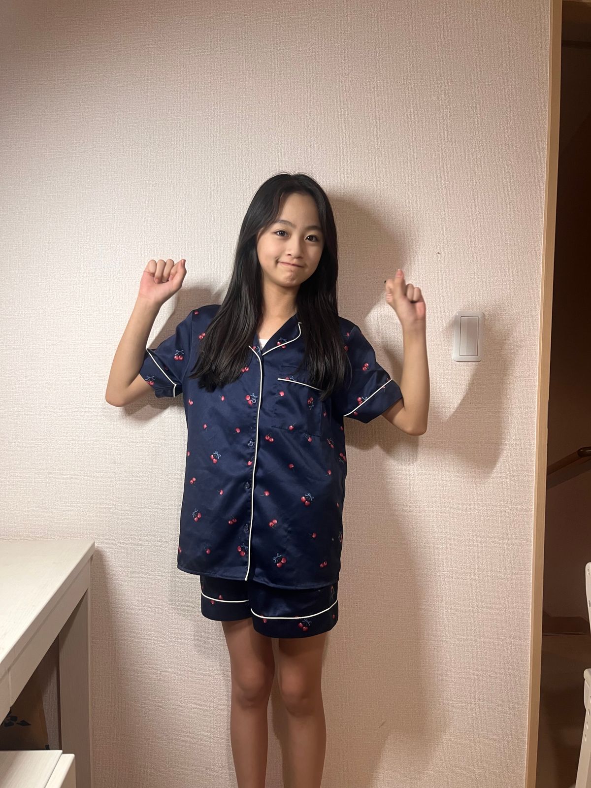 さくらんぼ柄の、てろっとした生地のパジャマを着ているよ! よく見るとリボンで結ばれているさくらんぼなのがかわいいでしょ♡