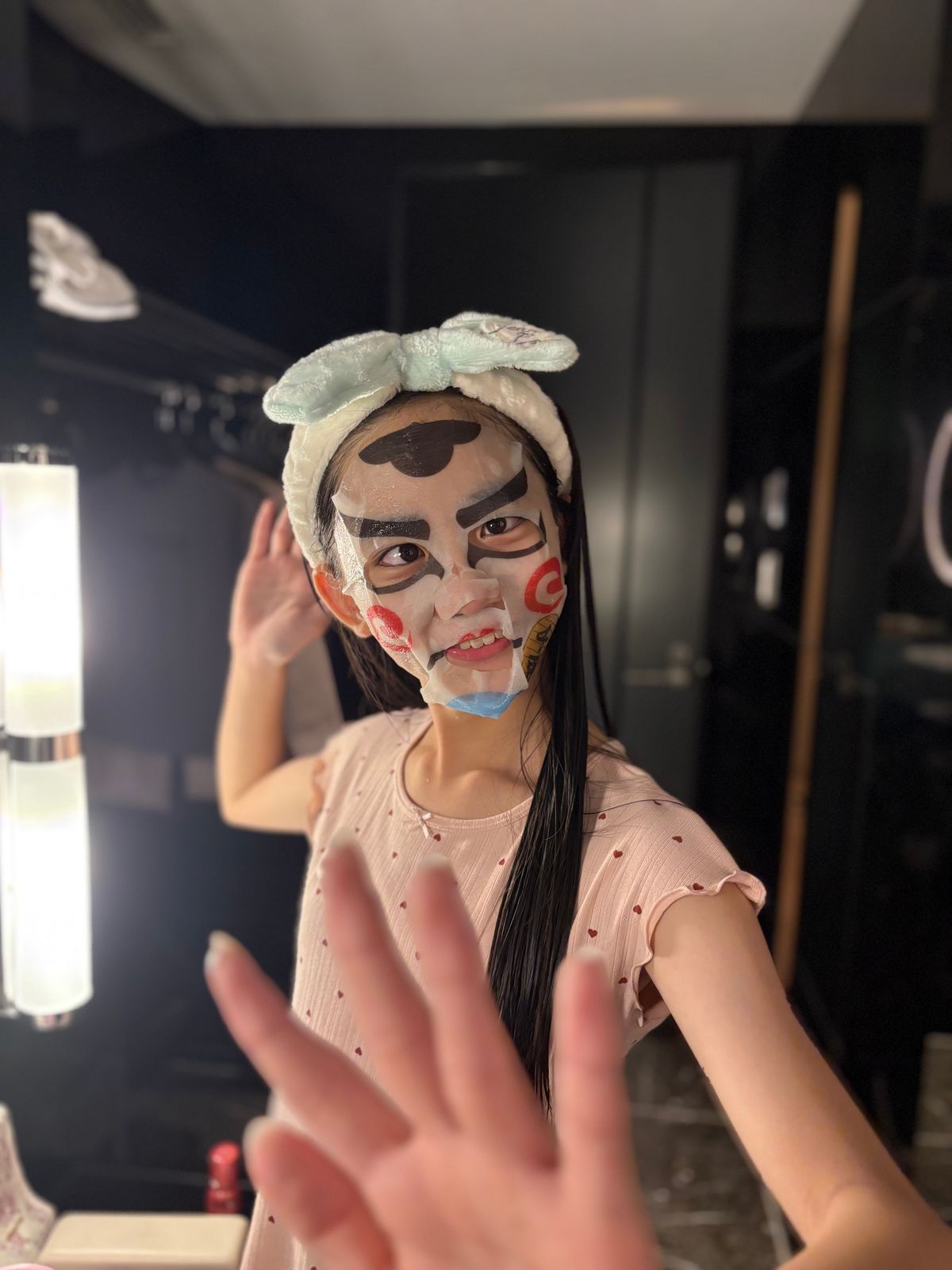 毎日ではないけれど、フェイスパックをしているよ! 色々な種類のパックを楽しみながら、歌舞伎をまねてアートマスクで遊ぶのもお気に入り!