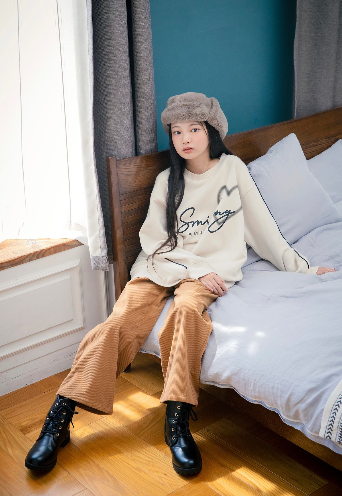 トレーナーとコーデュロイのワイドパンツでゆるっとラフに着こなし♪ ふわふわのフライトキャップは、コーデに合わせてブラウン・グレー系を合わせるとおしゃれにまとまる♡
