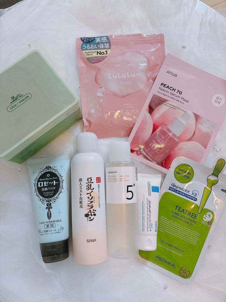 夜はお風呂から上がったらすぐにイソフラボンのミスト化粧水。そのあとナンバーズインの化粧水を使ってからラロッシュポゼの保湿クリームで肌ケアをしているよ♡