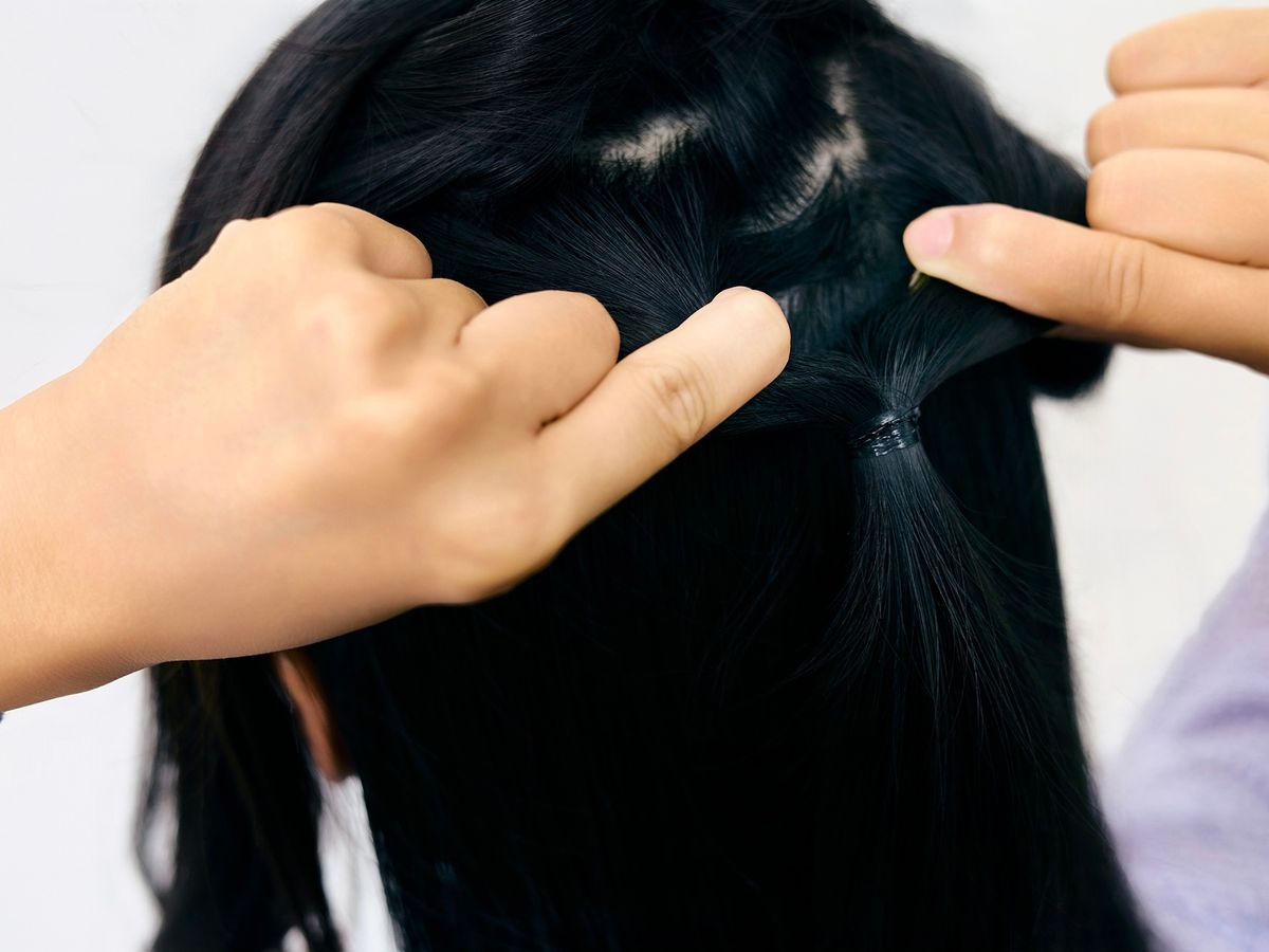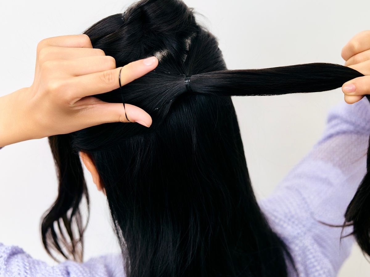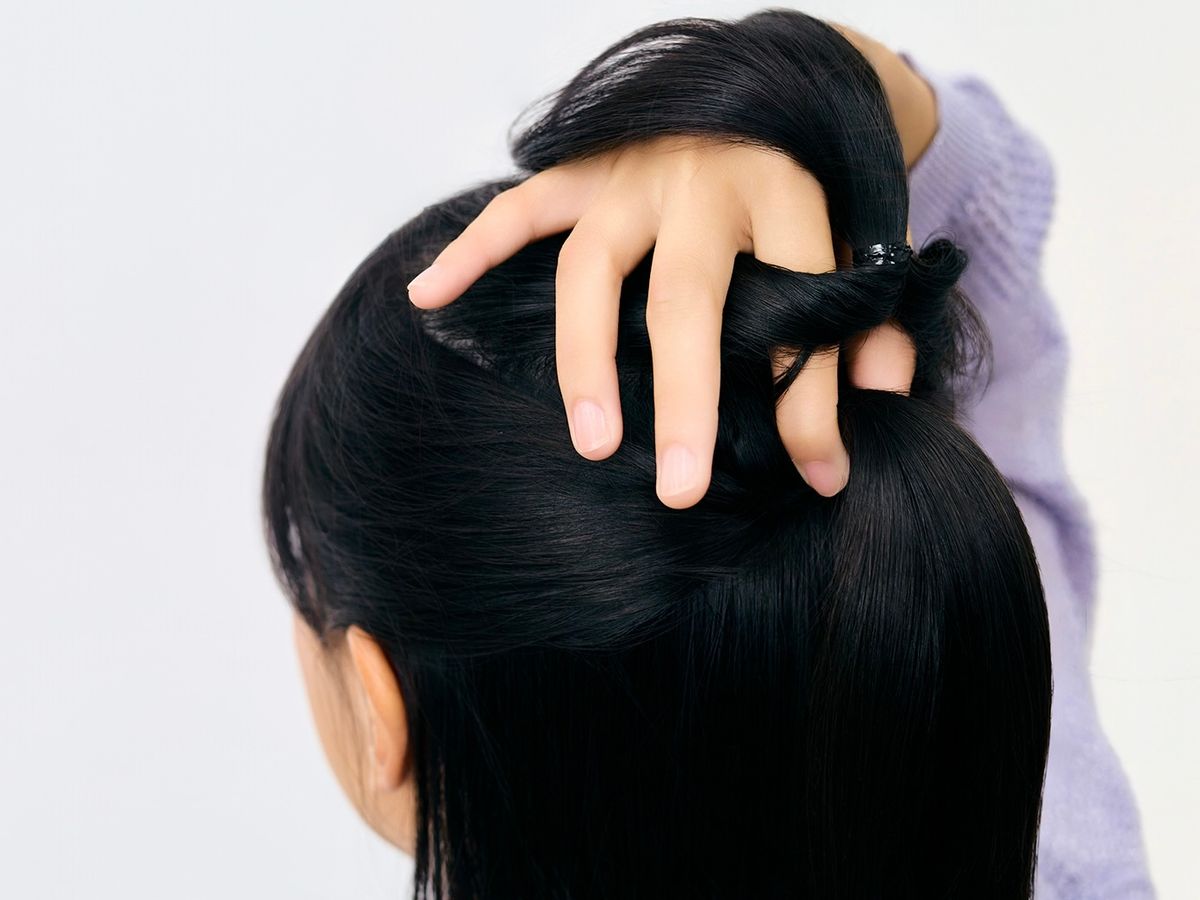 ① トップの髪をとって、高めの位置でひとつに結んだら、内側から外側に向かってくるりんぱしよう。