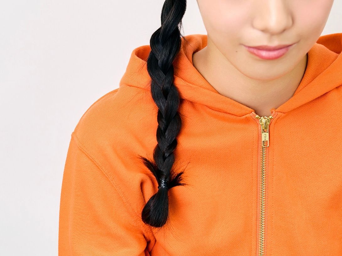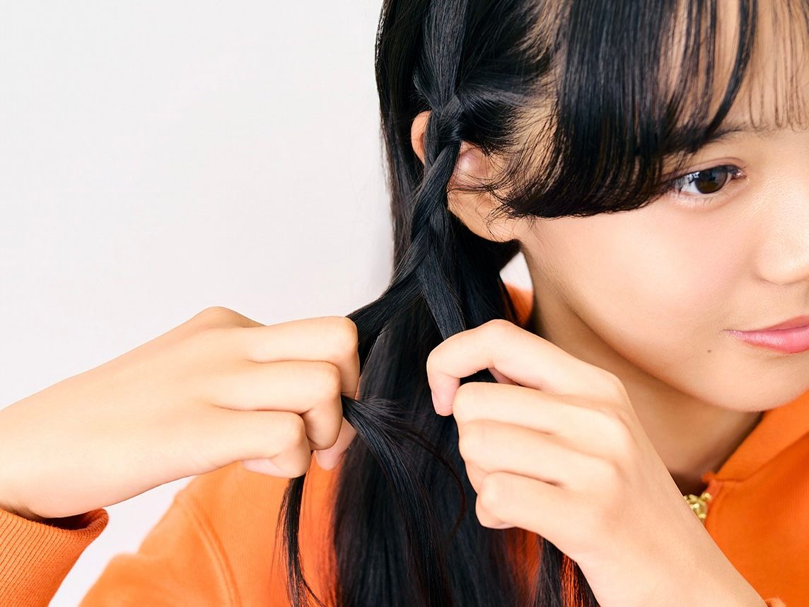 ③ 結んだ毛束をみつあみにする。毛先はぬききらずだんごにすると、しあがりがキレイになるよ♡