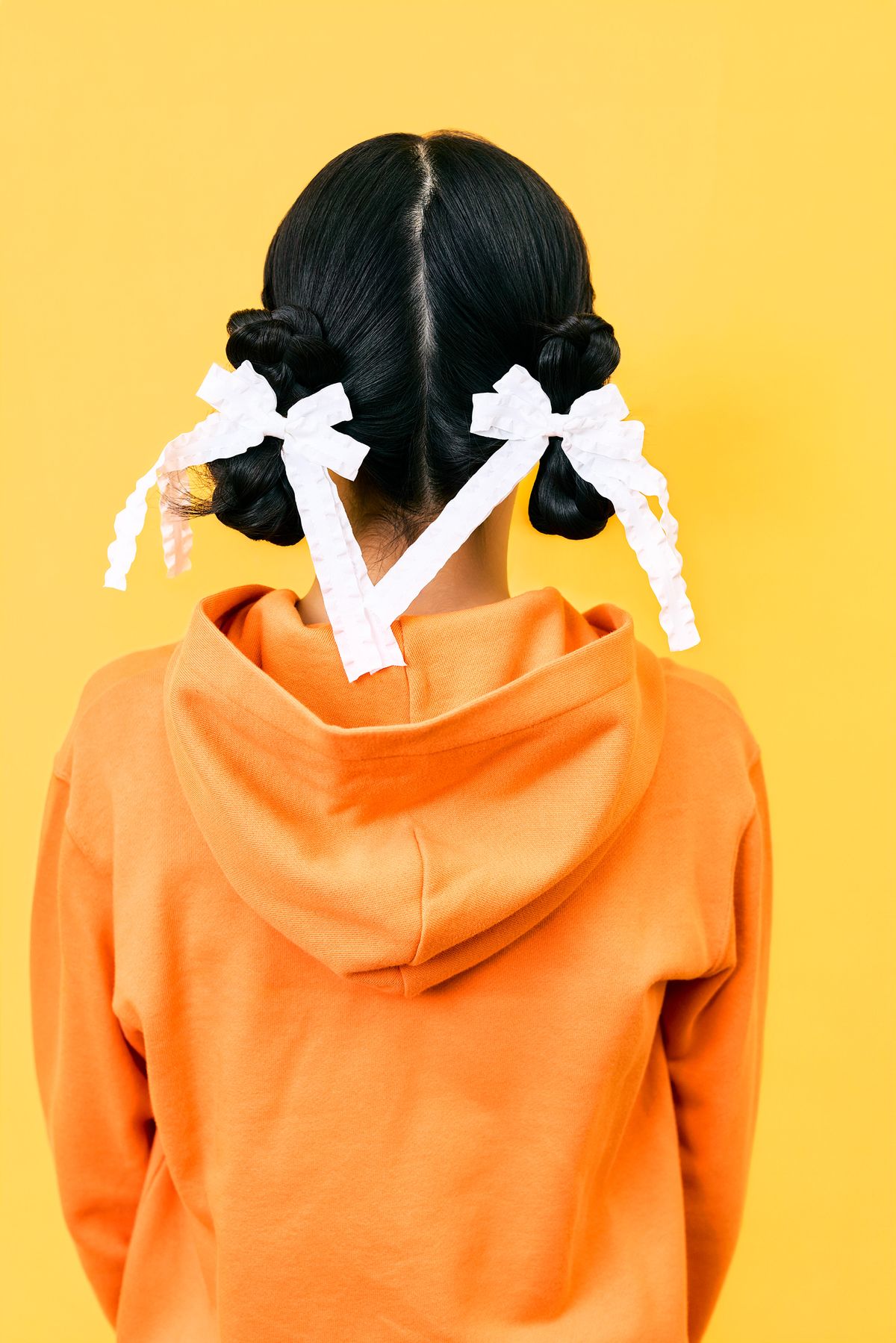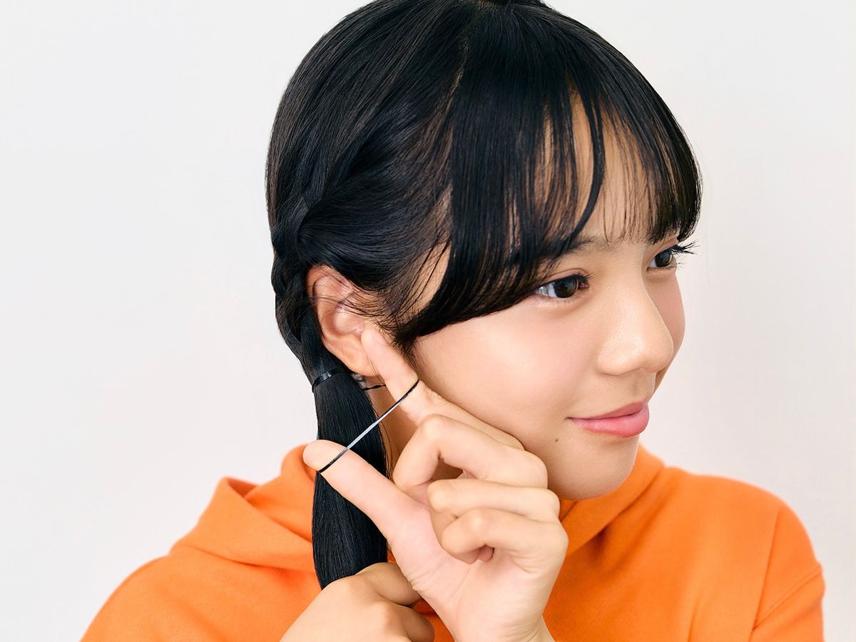⑤ みつあみをおりたたんでできた縦長のおだんごに真ん中をゴムで結ぶ。ゴムはヘアアクセでかくしても◎!