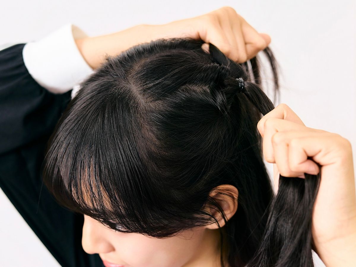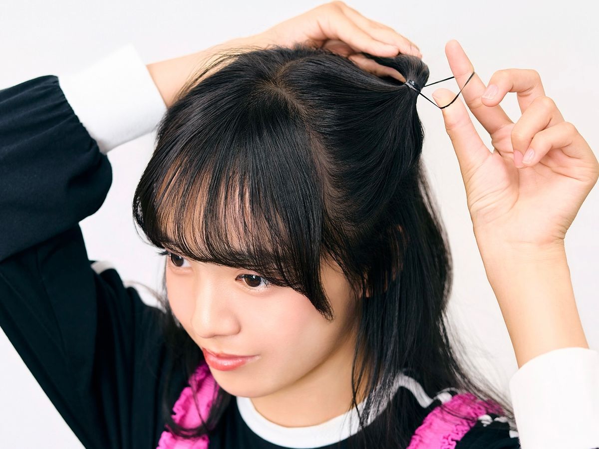 ① こめかみからななめ上に向かって毛束をとって結び、基本のハーフツインの形にする。