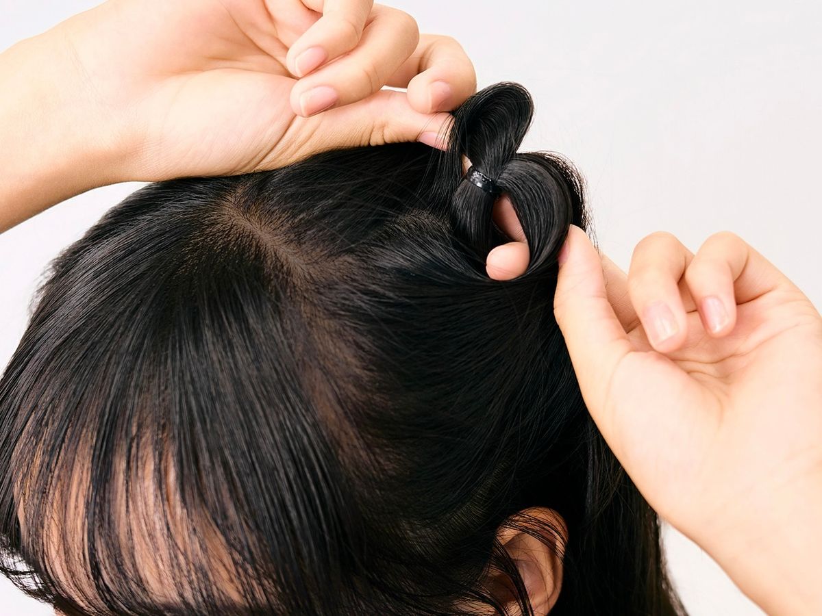 ③ 毛束をふたつに分けててにもち、結び目をぎゅっとゆっくり引きしめたらできあがり☆