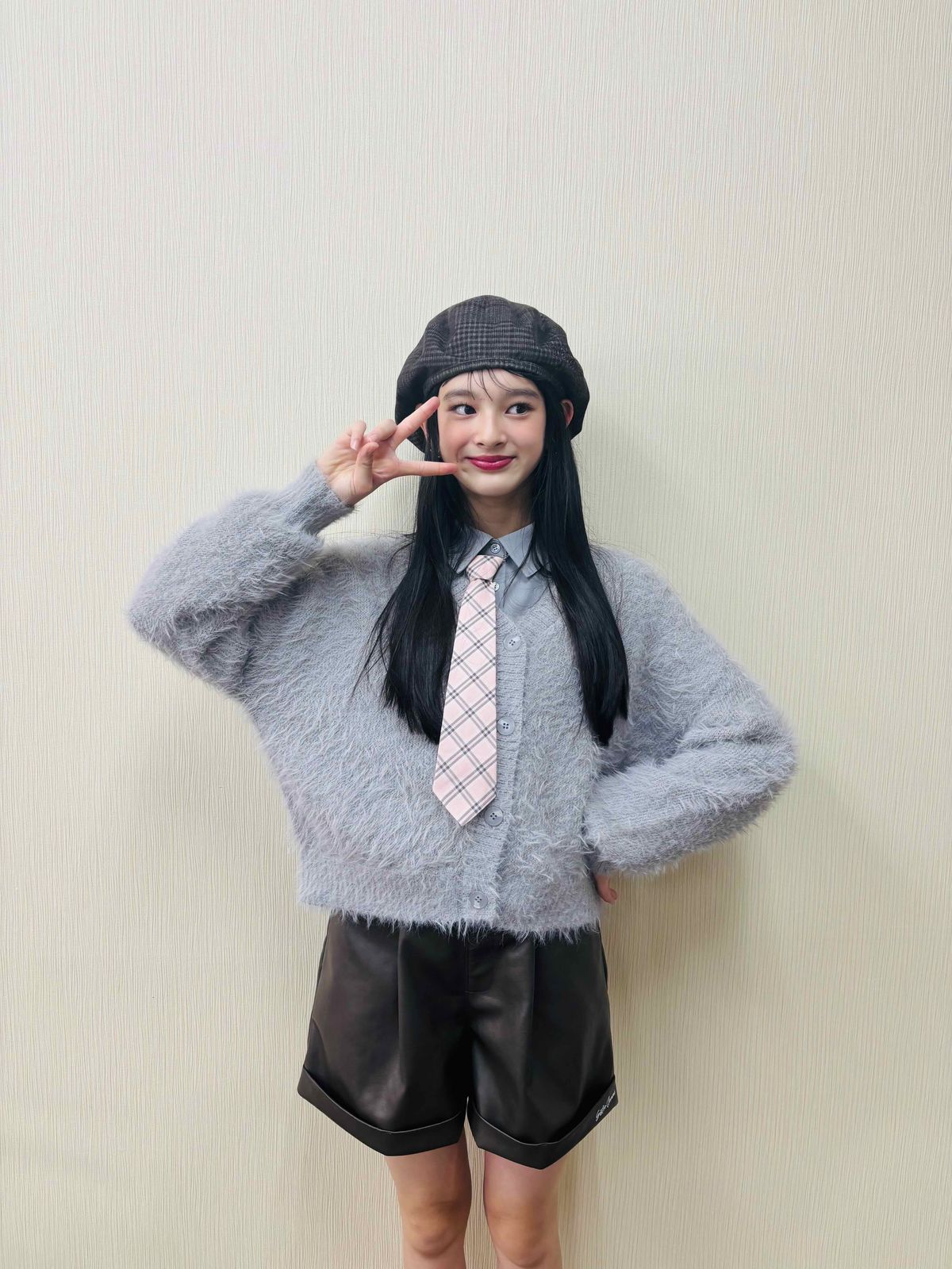 ふわふわニットにあえてレザーショーパンを合わせたのがおしゃれ! 韓国アイドルっぽさがイマドキ♡