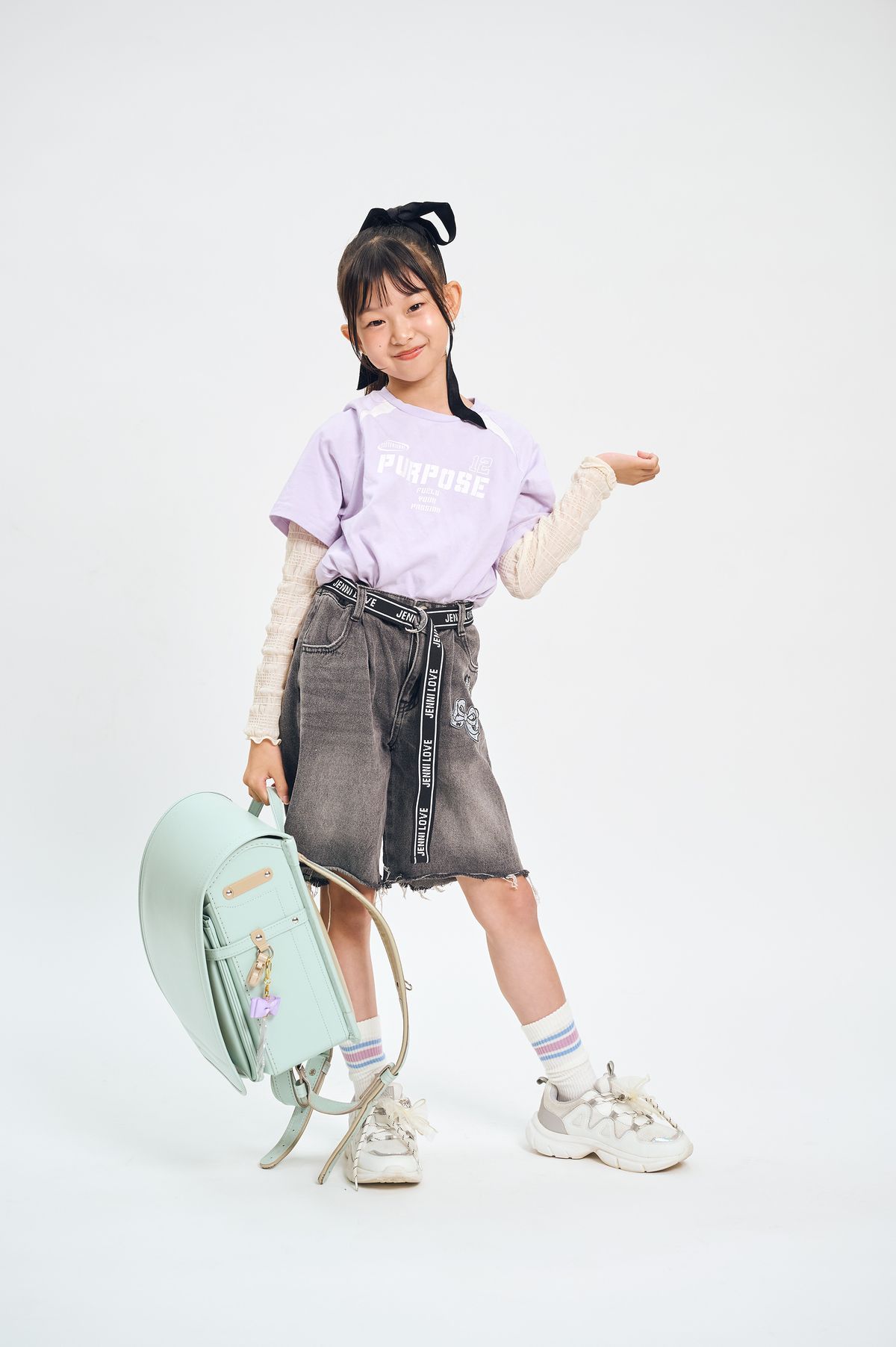 ゲームTとハーフパンツの元気スタイル。レースのカットソーやリボンのワッペンでガーリー要素をプラス♡