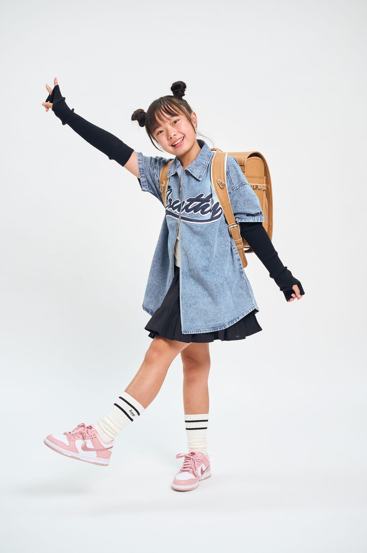 ダブルジップのデニムシャツに、アクセントになるピンクのスニーカーをイン♪ アームカバーで体温調せつも◎!