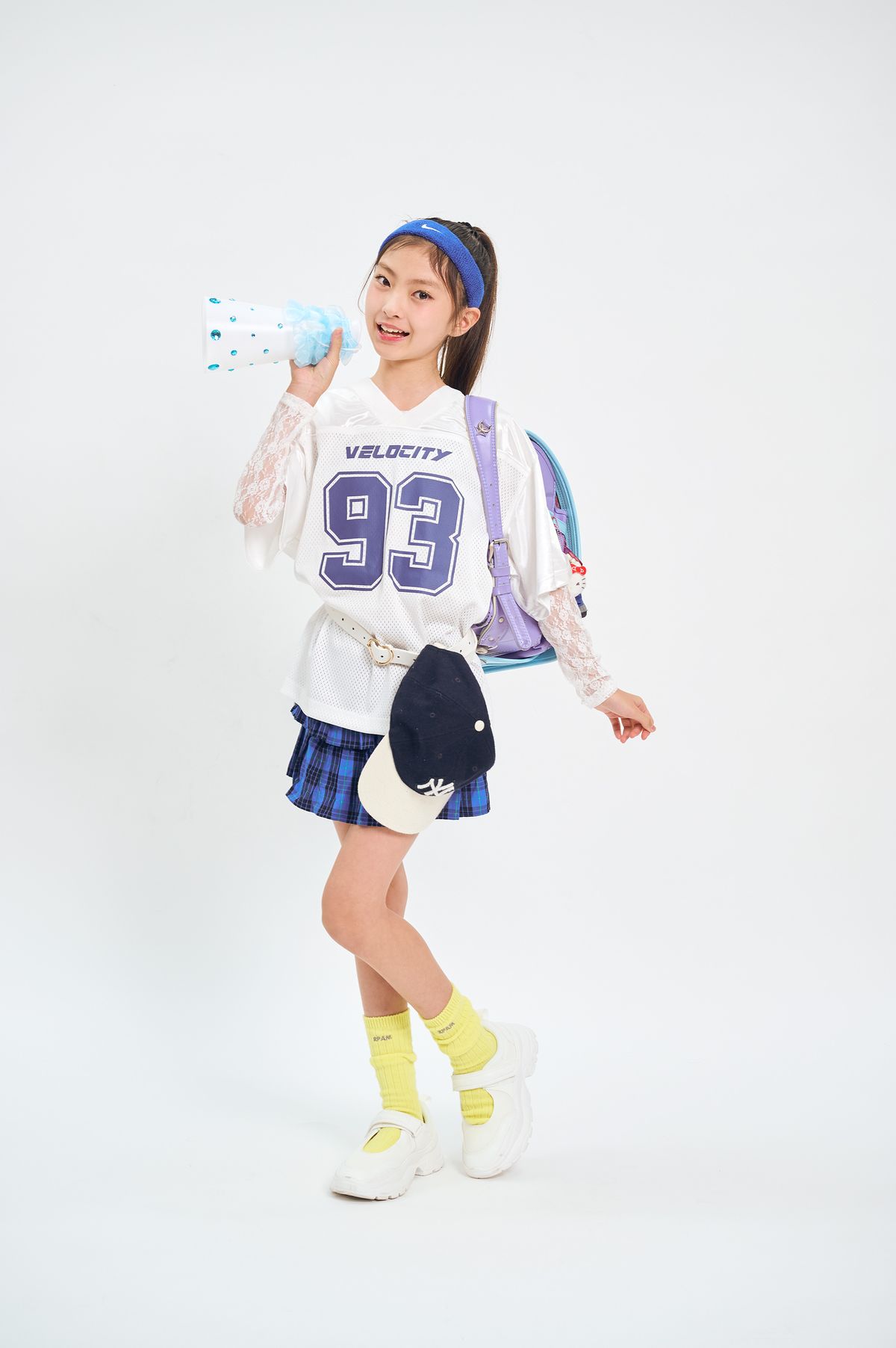 いつもはしないけど、スポテイストにちょうせん☆ Tシャツのロゴに合わせて青のアイテムを多くとりいれたよ!