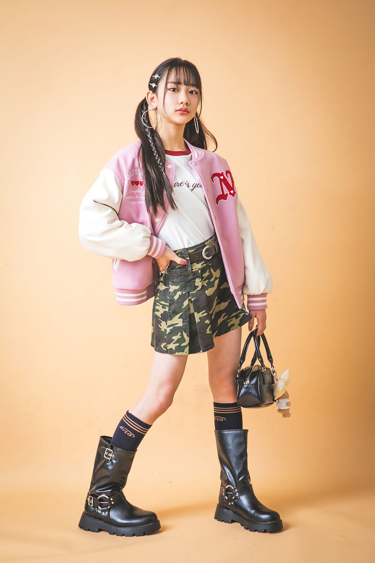 ちひな☆エンジニアブーツ¥7980/VIVIAN COLLECTION スタジャン¥27500/メゾ ピアノ ジュニア ラグランロンT¥1290/ジーユー ベルトつきスカート¥6930、バッグ¥4290、リボンチャーム¥1100、ラビ子チャーム¥2090、ソックス¥1430/すべてバイ ラビット ヘアピンセット¥330、イヤリング¥550/ともにパリスキッズ原宿本店