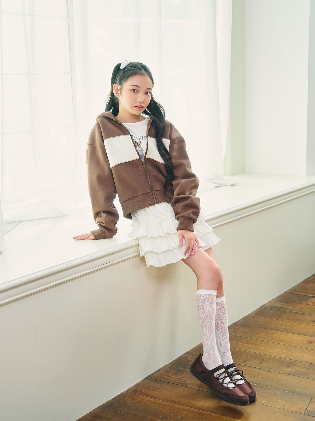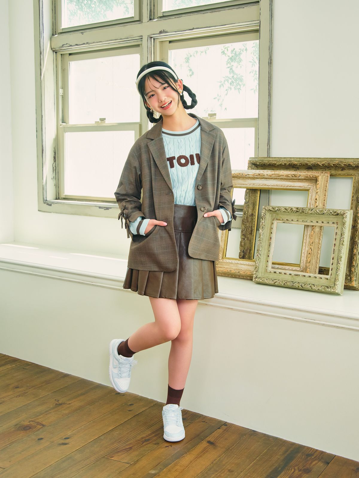 リサ☆ジャケット¥19800/メゾ ピアノ ジュニア ニット¥13090/ポンポネット ジュニア スカパン¥5500/シスタージェニィ カチューシャ¥550、イヤリング¥660/ともにパリスキッズ原宿本店 ソックス(3足で)¥1188/チュチュアンナ スニーカー¥15400/ナイキ スポーツウェア