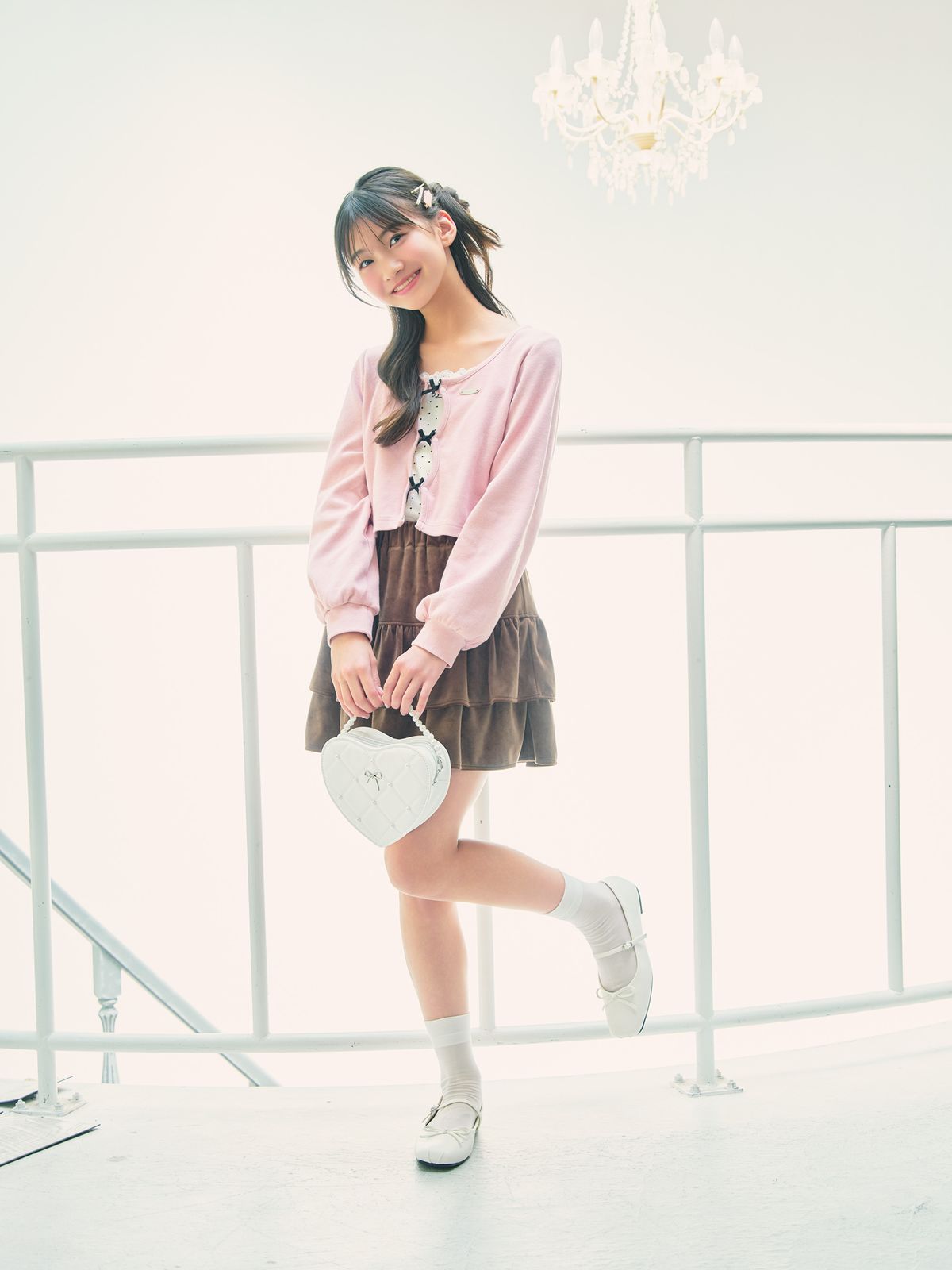 ミレイ☆カーデ&キャミ¥5500/ジェニィラブ スコート(9月下旬発売予定)¥1990/ジーユー ヘアピン(3本セット)¥330/ラティス ソックス¥1320/靴下屋(タビオ) バッグ¥1680/URBAN CHERRY シューズ¥3890/AmiAmi