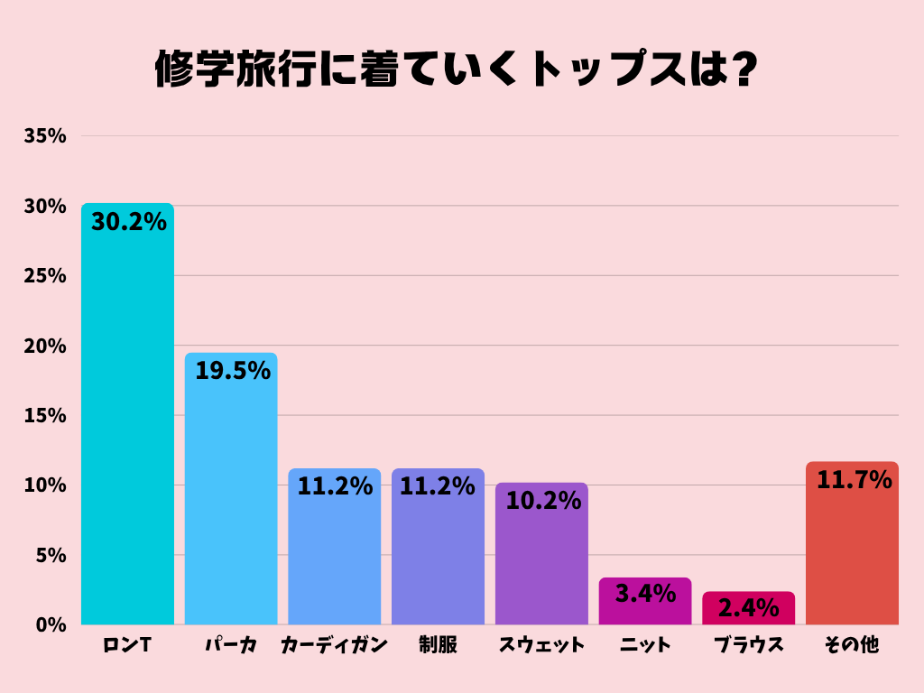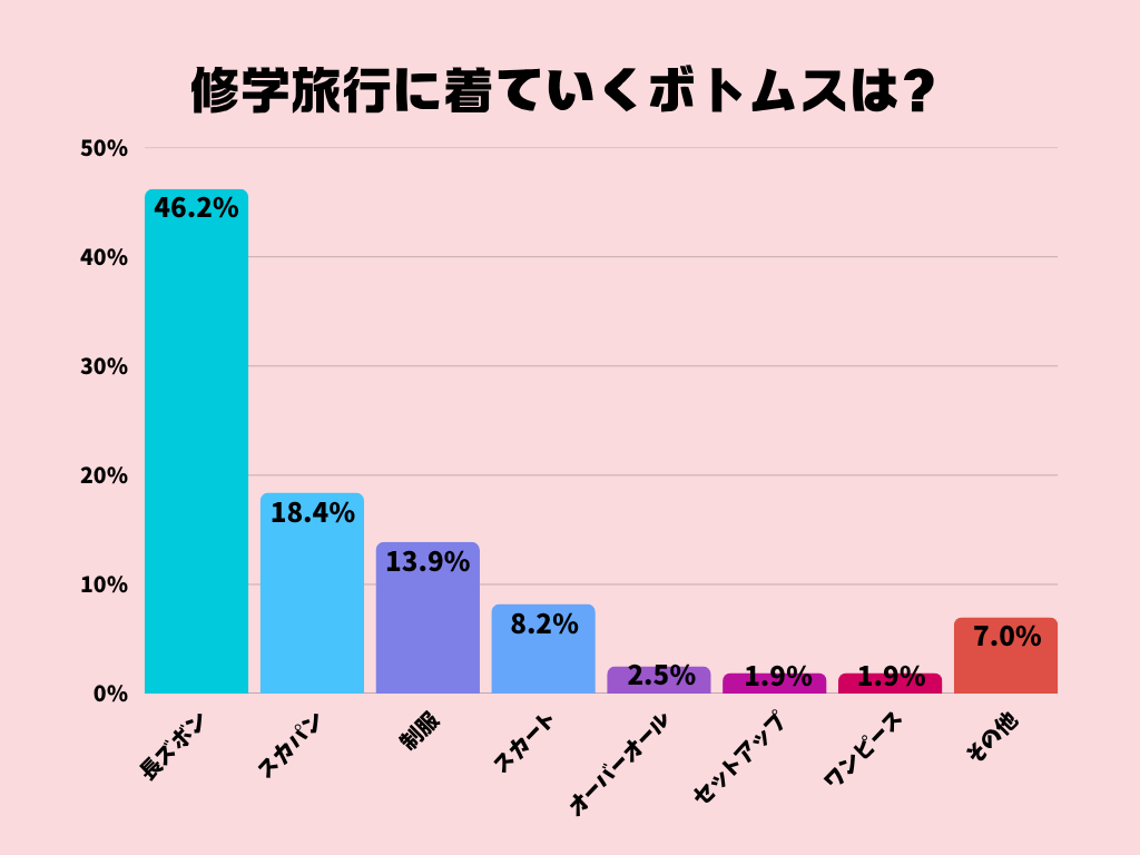 ボストンバッグは「汚れが目立ちにくくて軽く、荷物もたくさん入る」という理由で1位に。続いてリュックサックは、「移動が楽、疲れない」と納得の声。メインをボストン、サブにリュックサックを組み合わせる子や、街歩き用にななめがけショルダーを持って行く子も多く見られました。帰りにお土産を入れることも考えて、少し余裕のあるサイズを選ぶのがポイントになりそうです。