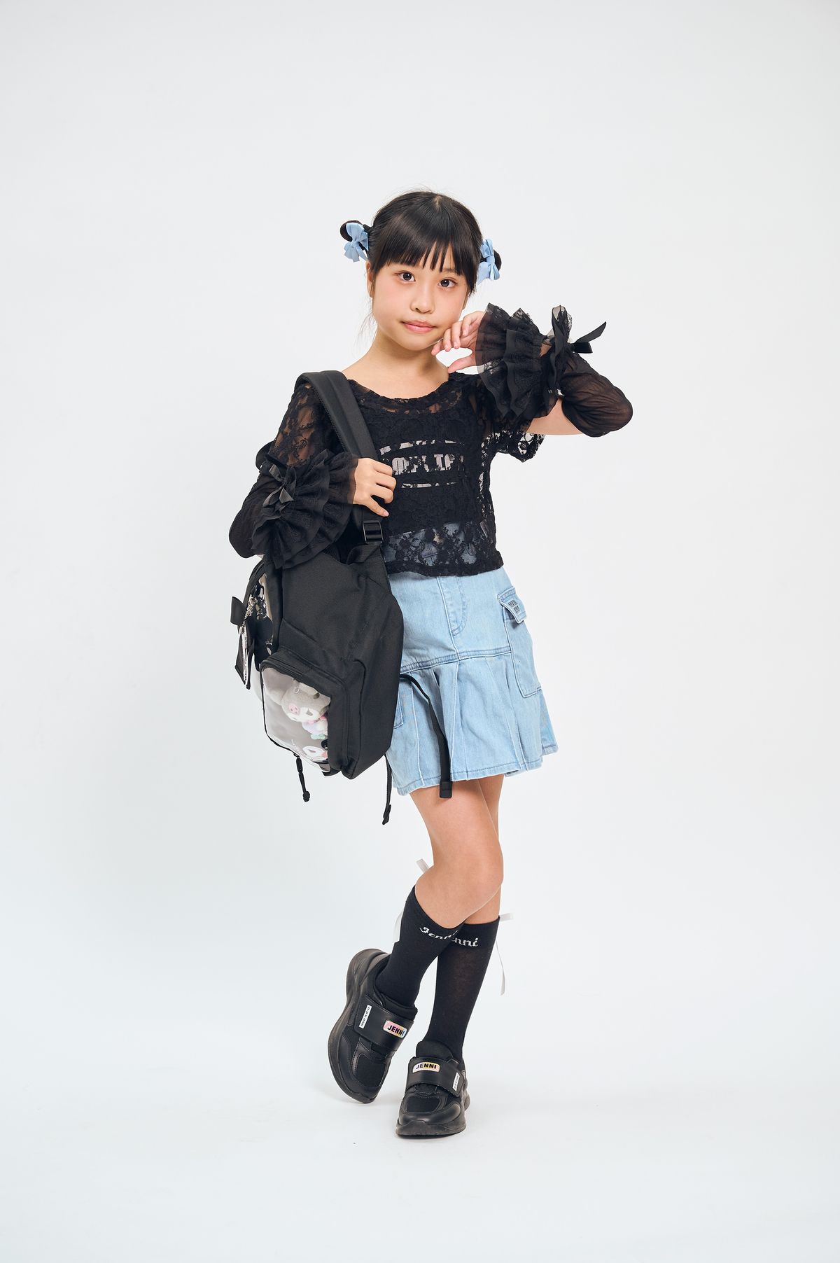 黒のレーストップスと小物で、高学年らしい大人っぽコーデに。カーゴデニムでリアルな通学コーデを追求!