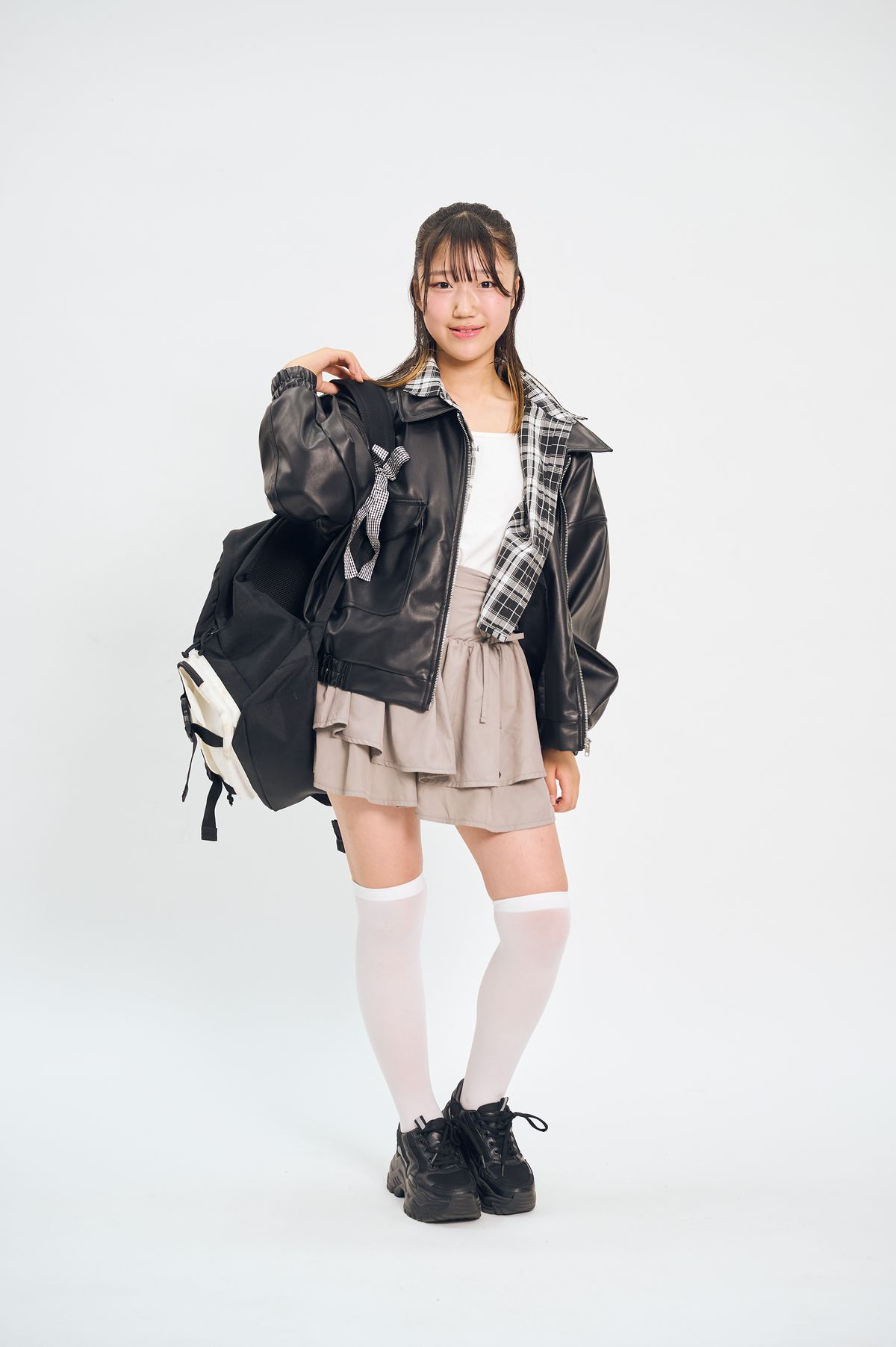 レザー風ジャケットでクールにしつつ、スカートで親しみやすさも放出☆ チェックをのぞかせるのがこだわり!