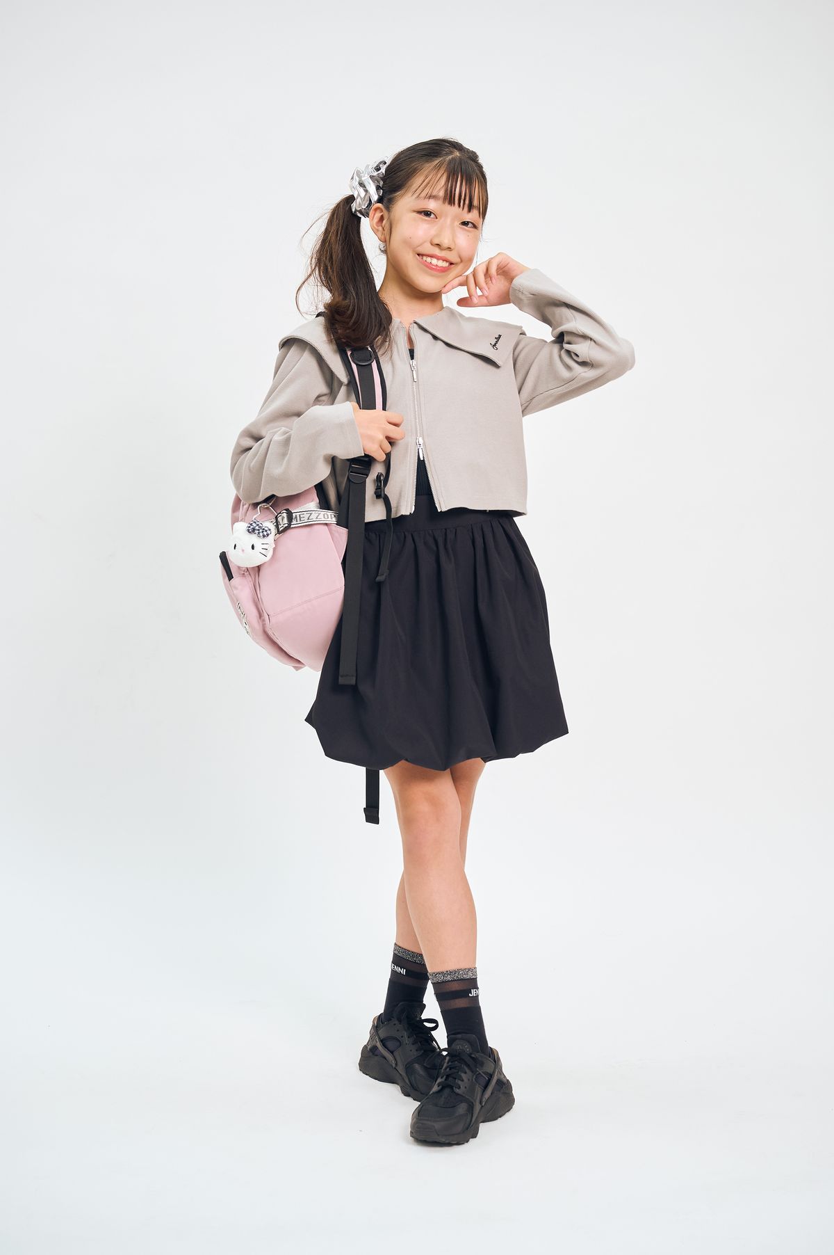 ブラック多めのコーデで大人っぽくしたよ♪ リュックにキティちゃんをつけて、かわいい要素もわすれずに♡