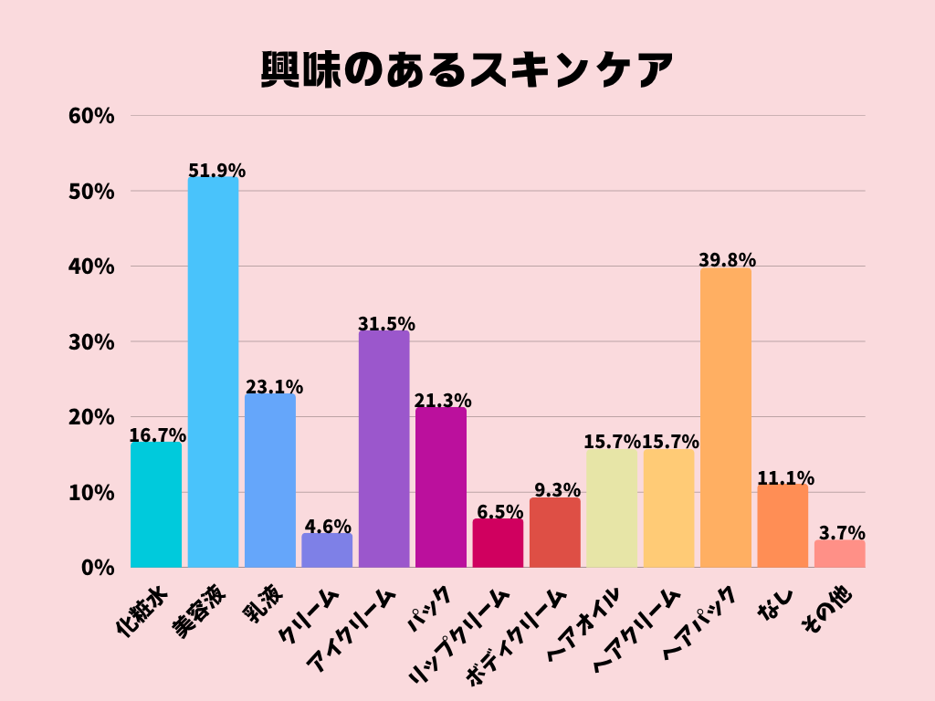 「まだ使ってないけれど気になる!」という声が多かったのは、美容液。次いでヘアパックやアイクリームなど、少しリッチで大人っぽいケアアイテムに関心が集まっていました。身近なスキンケアから、美容の意識をステップアップさせたい気持ちがうかがえます。