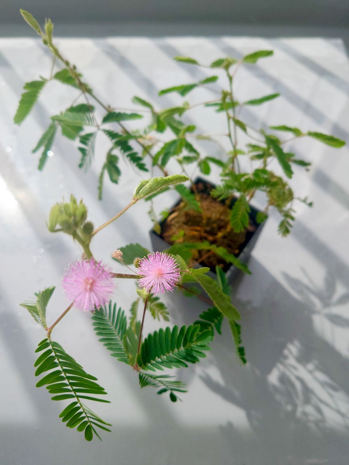 さわると葉っぱが閉じてしまう植物で、花は初めて見たんだけど、可愛らしいピンクで、 横から見るとボールみたいに丸いカタチをしてたー