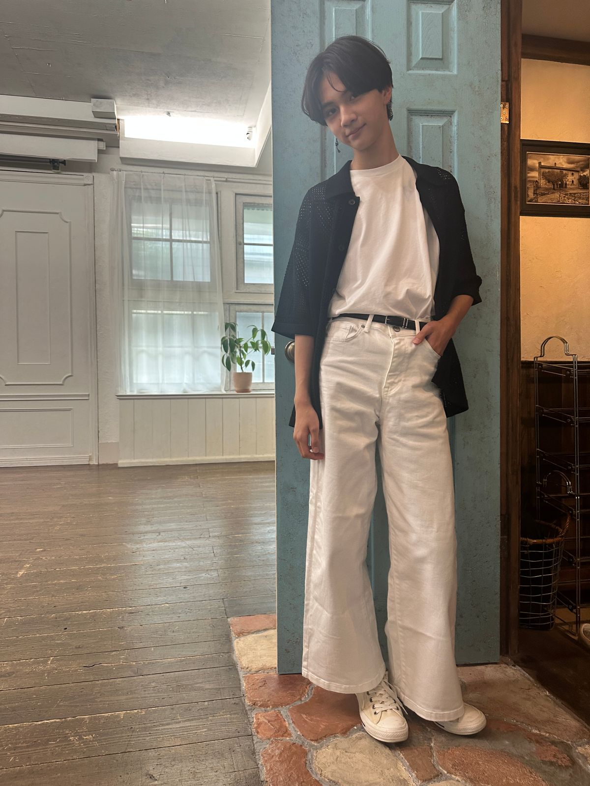 ホワイトデニムで全体的に洗礼されたコーディネイトに。カーディガンだけブラックを投入して、落ち着いた雰囲気を作れるよ。