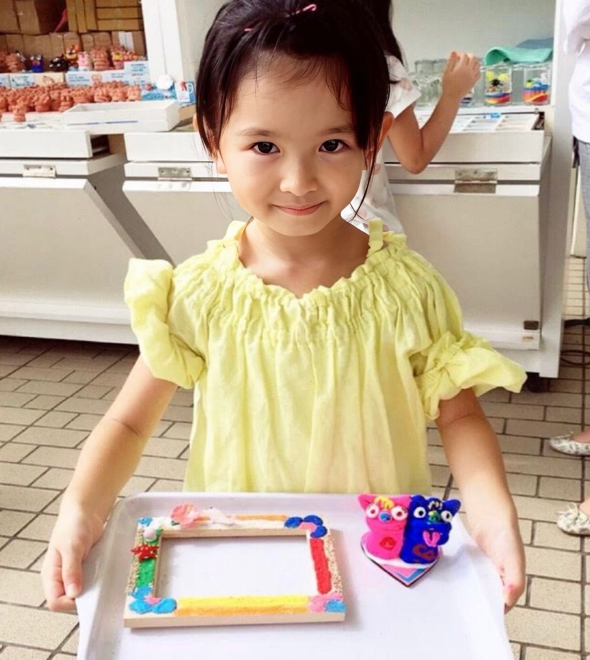 小学校低学年のとき、敬老の日のプレゼントに手作りの物を贈りたくて陶芸工房で作ったよ。焼き物はシーサー、写真立ては貝や海の砂でデコレーションした♡手芸(刺繍)/井上 美聖(ミア)