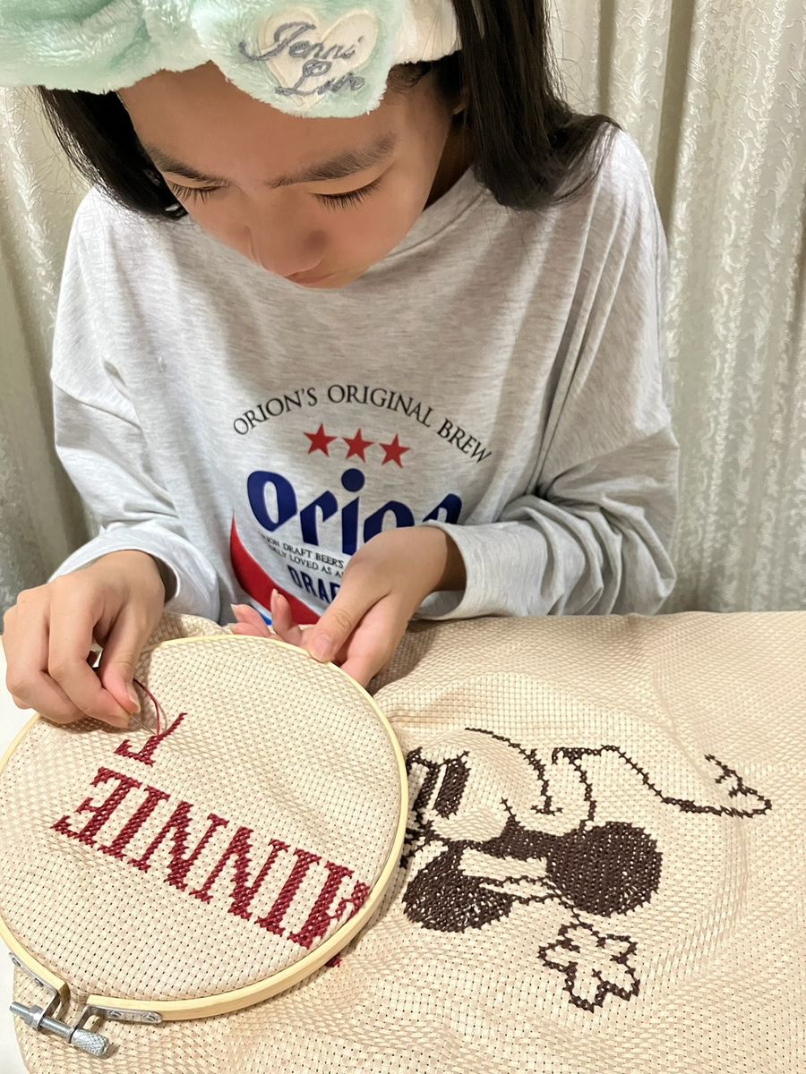 手芸クラブに入ってお裁縫に興味があって始めたよ。最初はかんたんなものに挑戦して、楽しくてハマった♡ 小さいサイズのものからスタートしたけど、もっとサイズの大きいのに挑戦しようと思ってクッションカバーにチャレンジ! クッションが2つあるので完成したらミッキーも作る予定!ダンボールコスメ、スクイーズ、紙工作(ミニランドセル)、1番くじ、絵/西森 星乃(ラナ)