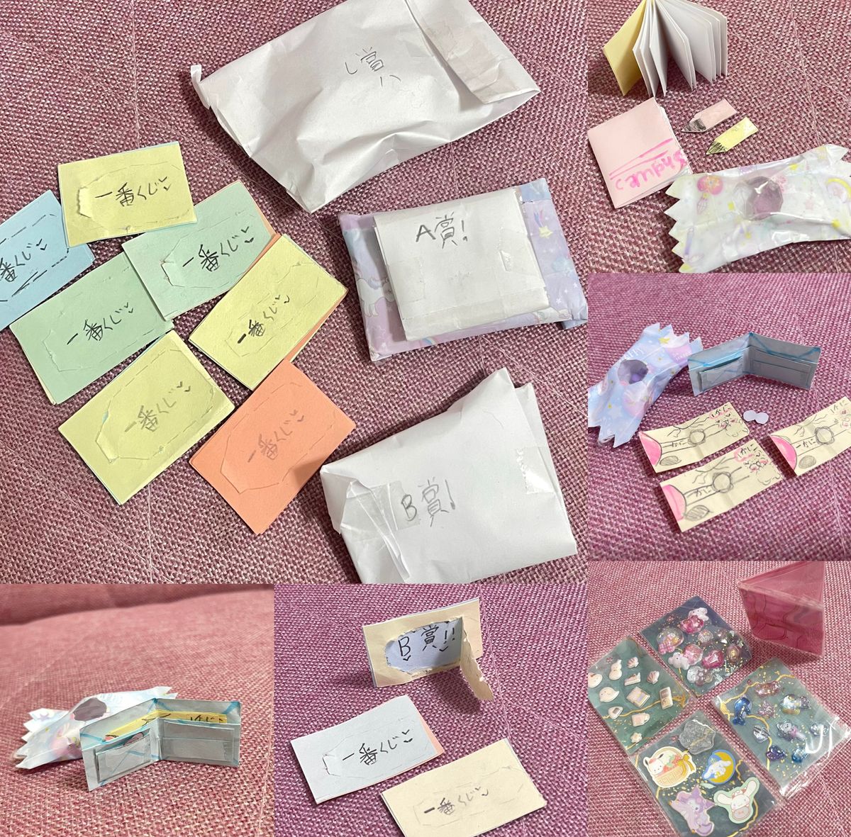 本物のくじみたいにピリピリと開けられるようにこだわって作ったよ。景品はキャンディー、ノート、シールなど。シールは本物みたいにラッピングをしてるところがポイント♡