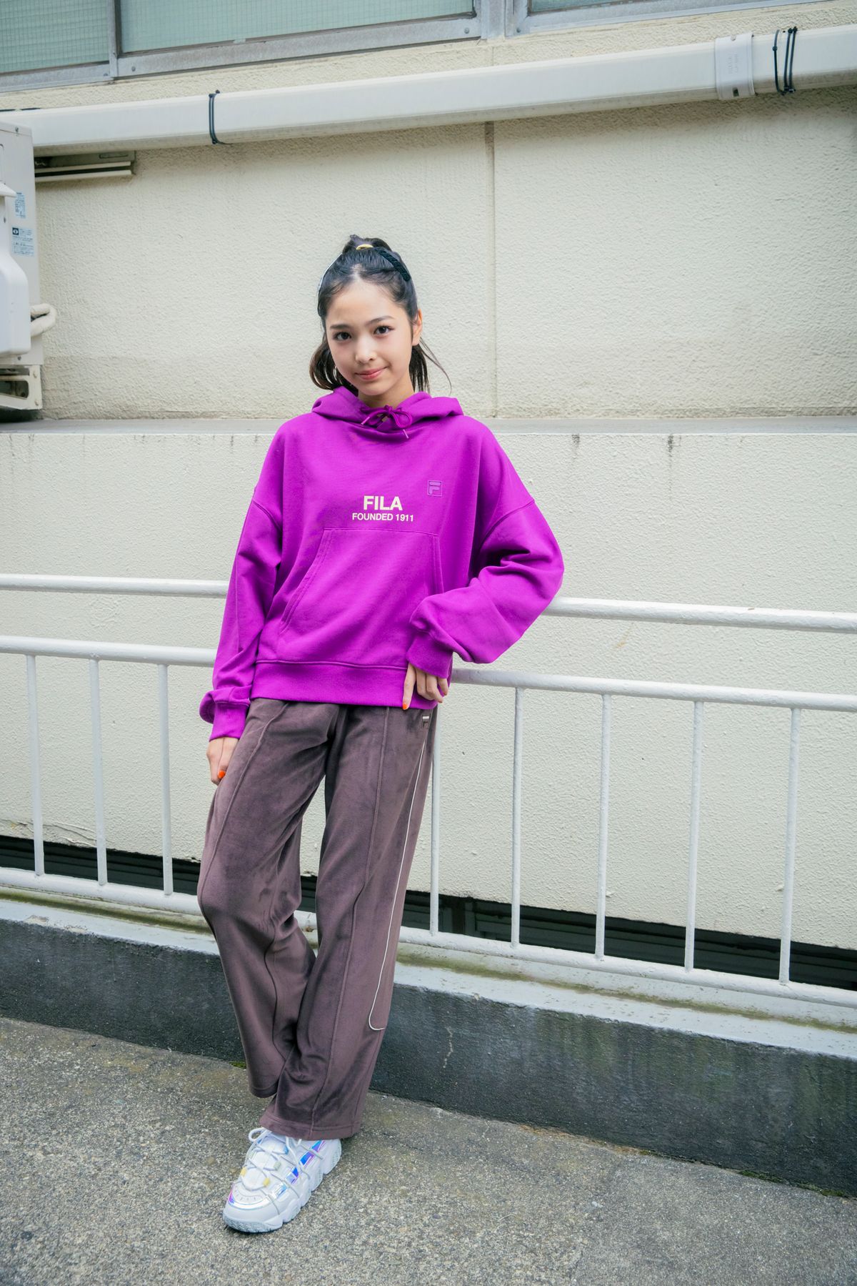 パキッとパープルにベロアパンツで、明るい色を取り入れたポップコーデに。トップスとボトムスの色を合わせると、統一感あり!ルナ☆パーカ¥7480、ベロアパンツ¥8250、スニーカー¥12100/すべてフィラ ヘアピン¥495/U(ユー)