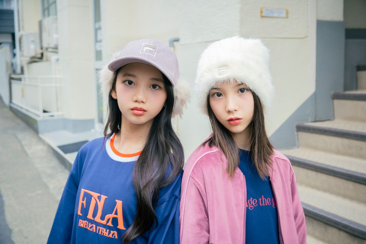 フライトキャップを1点投入して、季節感アップ。ブルー×オレンジのぷっくりタイプのロンTのロゴにもご注目! ツムギ☆ロンT¥6380、イヤフラップキャップ¥5830/すべてフィラ真っ白ボアにニット帽は、顔周りが1段階明るくなる一級品! ベロアのピンクジャケットで甘さもイン。リナ☆ベロアジャケット¥9350、スウェット¥6380、ニット帽¥3960/すべてフィラ