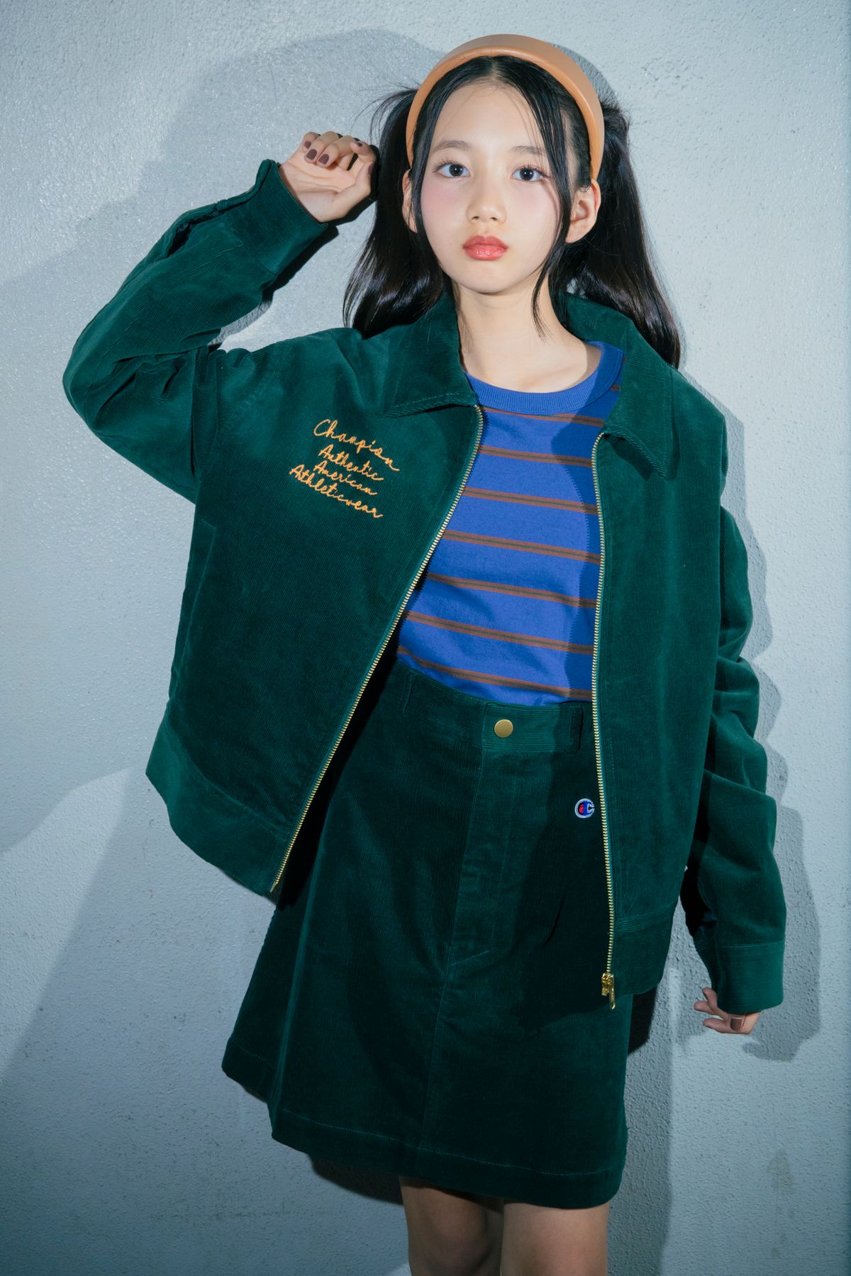 深めのグリーンのジャケットに同じくスカートを合わせて、とにかく秋のお姉さんコーデの完成。素材から季節感もたっぷりで、胸元のイエローロゴがお上品。ツムギ☆ジャケット¥18480、ロンT¥3190、スカート¥8690/すべてチャンピオン\合わせてチェック!/