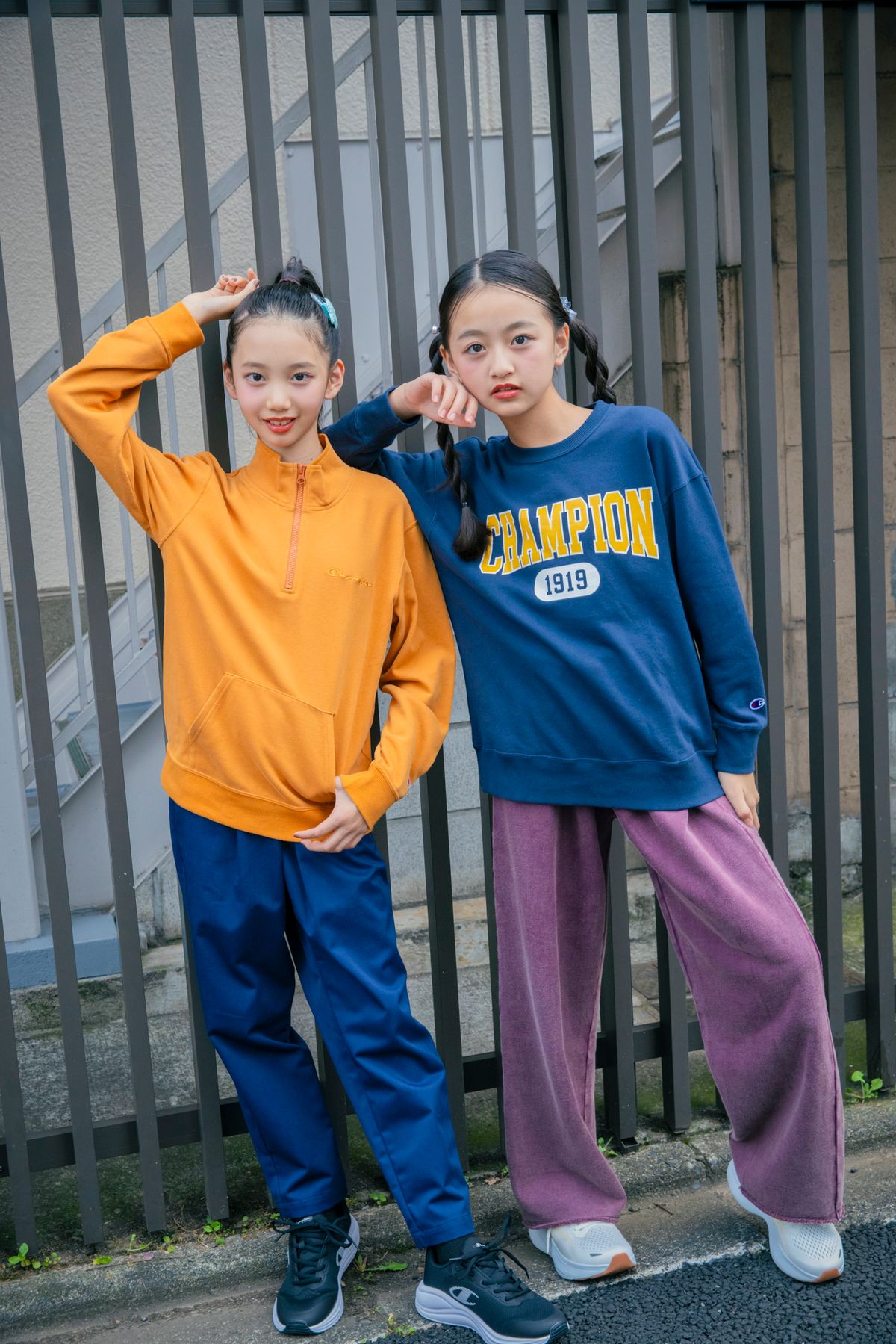 ハヤリのハーフジップに、ワンカラーにパンツを合わせてシンプルに。スポーツする時は、動きやすさにこだわって! ツムギ☆ジップスウェット¥4070、パンツ¥5390、スニーカー(参考商品)/すべてチャンピオン ヘアピン¥550/パリスキッズ原宿本店深みのある秋カラーネイビーは、トップスに取り入れてお目立ち。あえて重ね着なしで袖のロゴを見せつつ、パンツの素材で季節感もイン! カエデ☆スウェット¥4400、スウェットパンツ¥9790、スニーカー(参考商品)/すべてチャンピオン