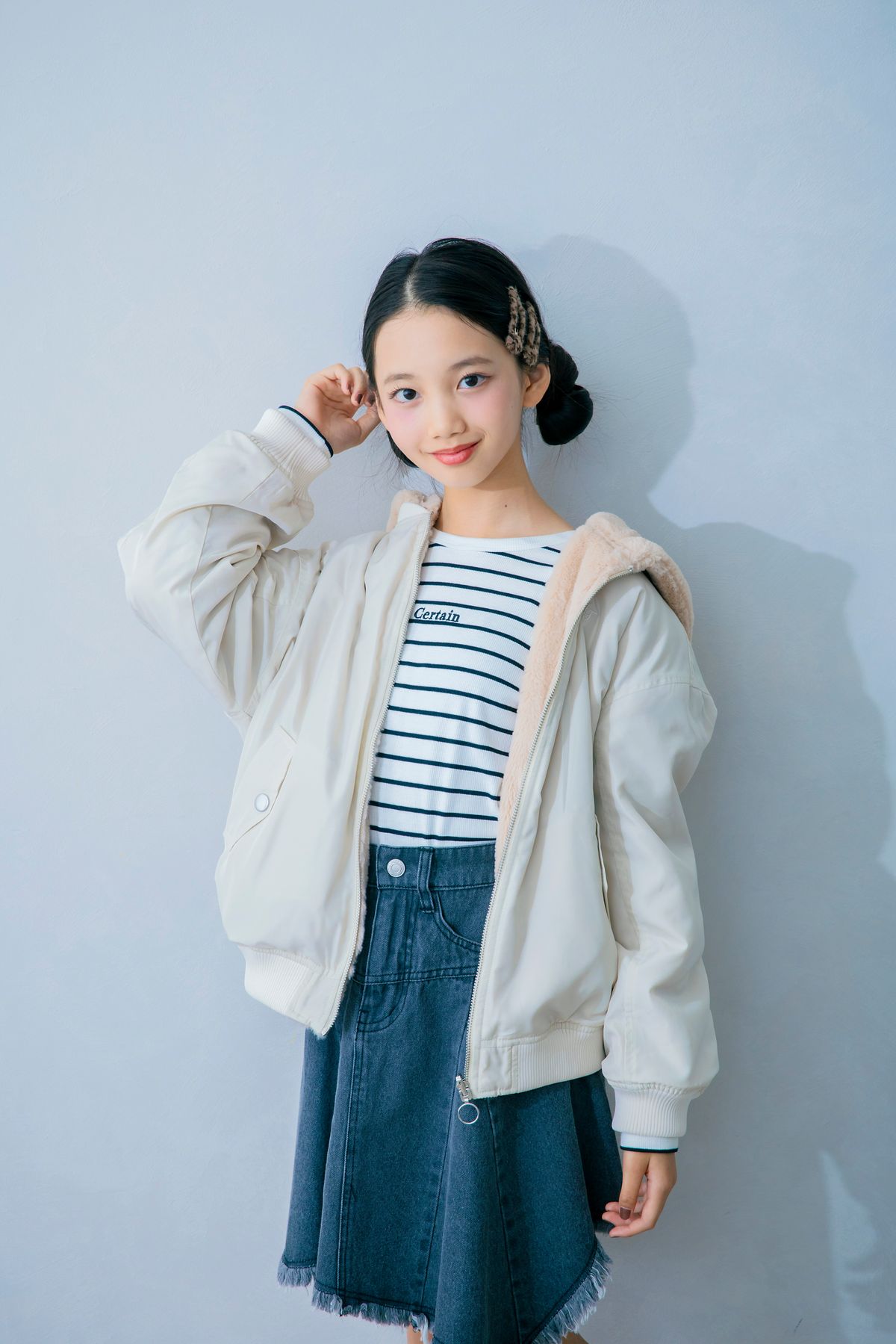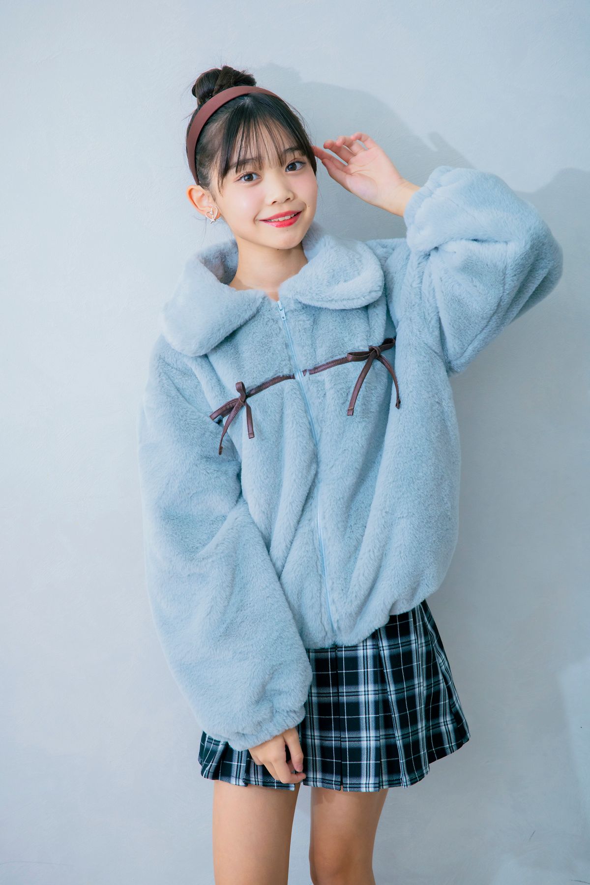 くすみ寒色もブルゾンは、せいそな甘さがレベチ! ブラウンのリボンで差し色も入って、冬ガーリー! マナ☆リボンファーブルゾン¥8690/バイ ラビット スカート¥3289/ピンク ラテ カチューシャ¥330、イヤリング¥660/ともにパリスキッズ原宿本店